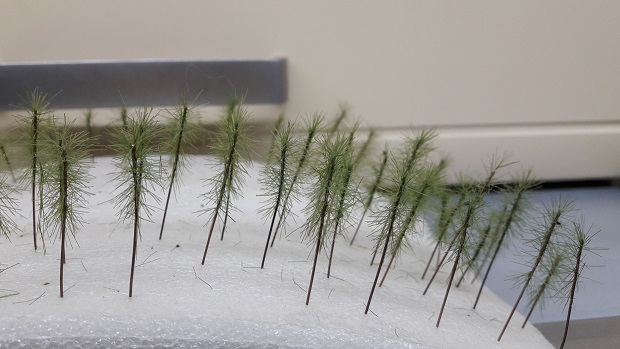 Kolejną operacją jest kształtowanie i strzyżenie drutów aby uzyskać charakterystyczny kształt gałęzi dla świerku/jodły ewentualnie modrzewi. Pień pokrywam warstwą kleju wikolopodobnego i posypuję bardzo drobnymi wiórami pozyskanymi z warsztatu meblarskiego. Po wyschnięciu należy pień i gałęzie pomalować aerografem lub farbami w aerozolu. Na gałęzie nanoszę klej butaprenopodobny i tak jak w przypadku małych drzewek przyklejam elektrosadzarką trawę długości 4,5-6mm. Po odczekaniu 2-3 minut mocno dmucham z góry aby włókna ułożyły się pod gałązki. Dalsze postępowanie jak w przypadku małych drzewek. Wykonanie 17 cm jodły zajmuje około 1 godziny.