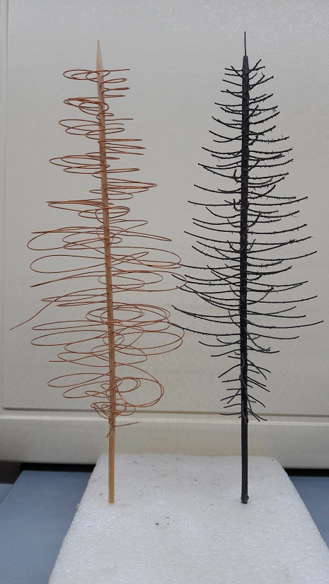 Najmniejsze (5-15mm) wykonuję z pomalowanego na kolor czarny drutu. Drut smaruję klejem butaprenopodobnym i metodą elektrosadzenia nanoszę "trawę" długości 4,5 -6mm. Po wyschnięciu kleju strzygę nożyczkami trawę tak aby uzyskać stożek. Klejem w aerozolu spryskuję uzyskane gałązki i obsypuję bardzo drobną ciemno-zieloną gąbką.