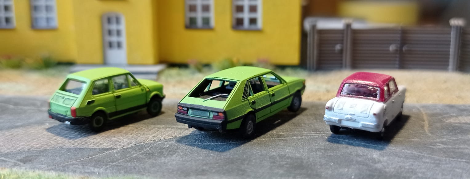 Kończę autka. Najfajniejszy jest Mikrus. Jak się chce to można dorobić mu budę i ma się dwie wersje w jednej jak się poświęci 5 minut. Polonez bez szyby bo zgubiłem. Lusterka pourywały się podczas maskowania. Dorobi się (kiedyś ) Jestem z nich zadowolony