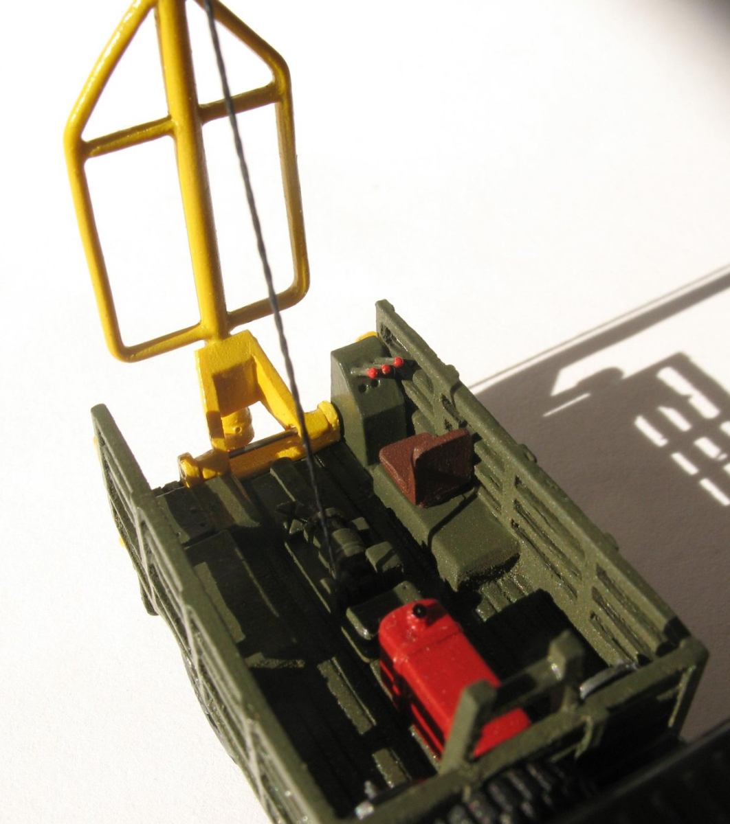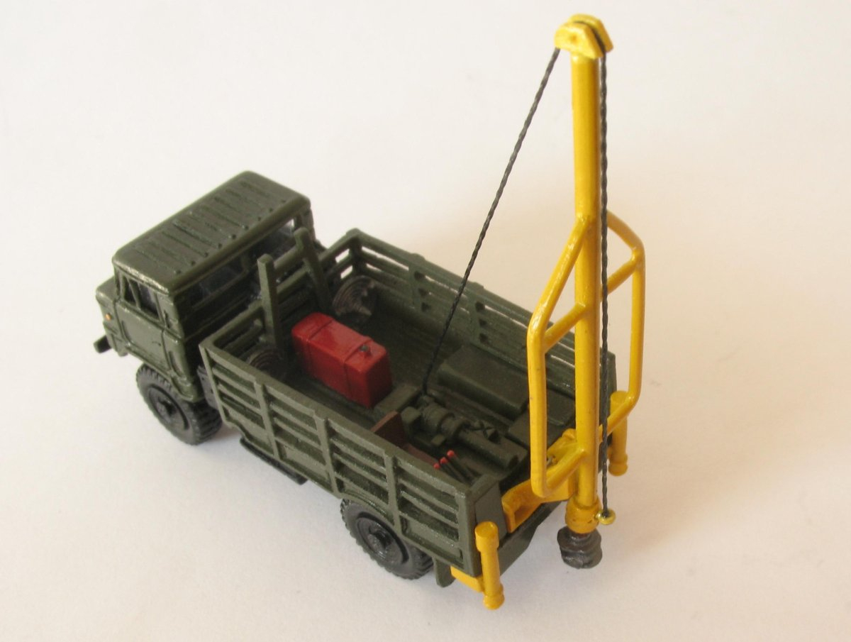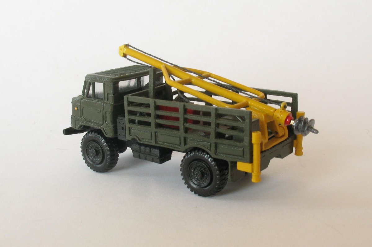 W prezentowanym modelu ramię wiertnicy jest składane. Na czas transportu jest kładzione i spoczywa na pionowej podporze umieszczonej za kabiną. W modelu tak jak w oryginale na skrzyni ładunkowej umieszczono poziomy mechanizm napędowy wiertnicy z liną, dodatkowy zbiornik paliwa, dwa wymienne świdry talerzowe oraz pulpit operatora z manipulatorami plus siedzisko. Na końcu wiertnicy umieszczony jest na stałe standardowy świder ślimakowy. W zestawie z modelem są także na wyposażeniu dwie stopy podporowe ( stabilizacyjne) montowane do tylnych siłowników. Niestety nie ująłem tego na fotkach. Ten model wiertnicy zamontowany na GAZ66 często można było spotkać na naszych budowach. Myślę, że może stanowić ciekawe uzupełnienie makiety.