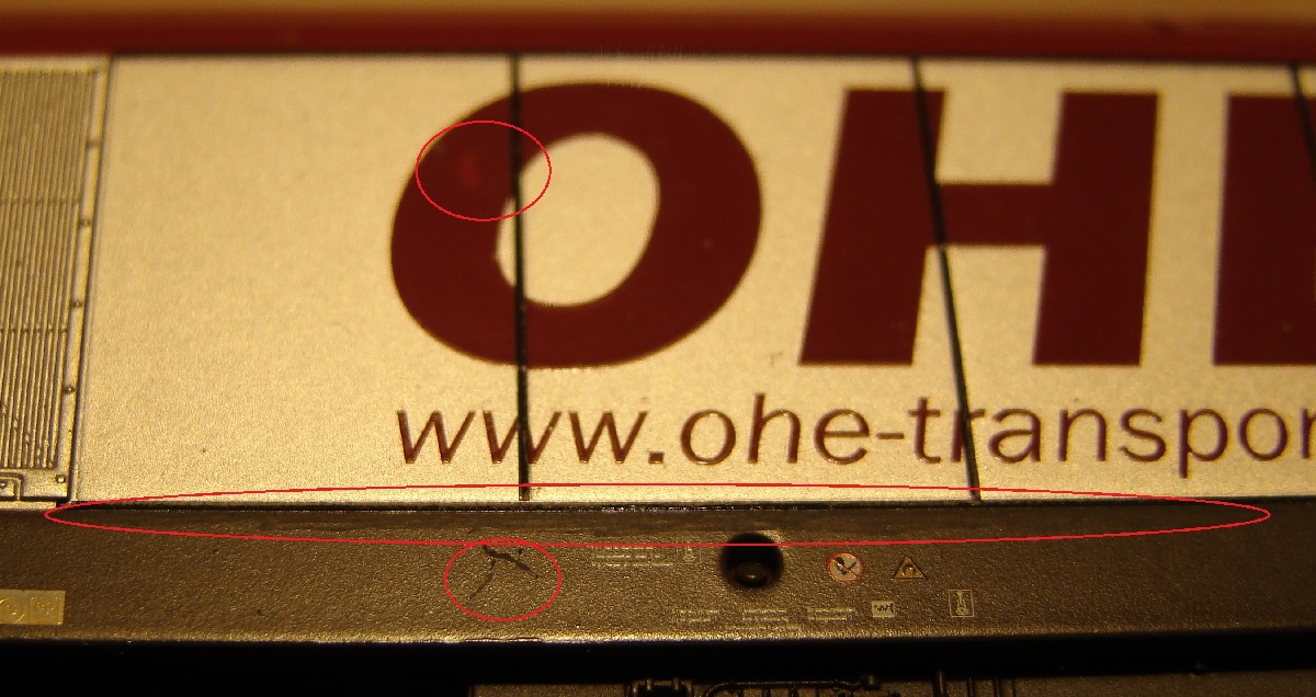 Wszytko było by ok gdyby trzy nie wielkie skazy na modelu: niewielkie zarysowanie, ślad po kleju? oraz niewielki zamalowany odprysk (szczegóły na zdjęciach).