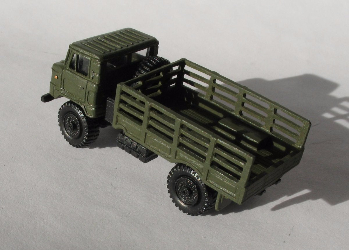 Otrzymałem z Ukrainy model, GAZ66 (deskowana ażurowa skrzynia ). Producent Bogdan Kirustyniec. Pojazd wykonany w technice - odlew żywiczny, szybka kabiny wytłaczana. Produkcja krótkoseryjna, tzn. partie po 30 szt. GAZ 66 produkowano w latach 1964 r. - 1999 r. Pojazdy GAZ 66 były na wyposażeniu LWP a także w służbie cywilnej. Do dziś można spotkać te pojazdy na naszych drogach. Szczególnie popularne były tzw. wiertnice, montowane na GAZ 66. Orientacyjna cena modelu - 12 euro.