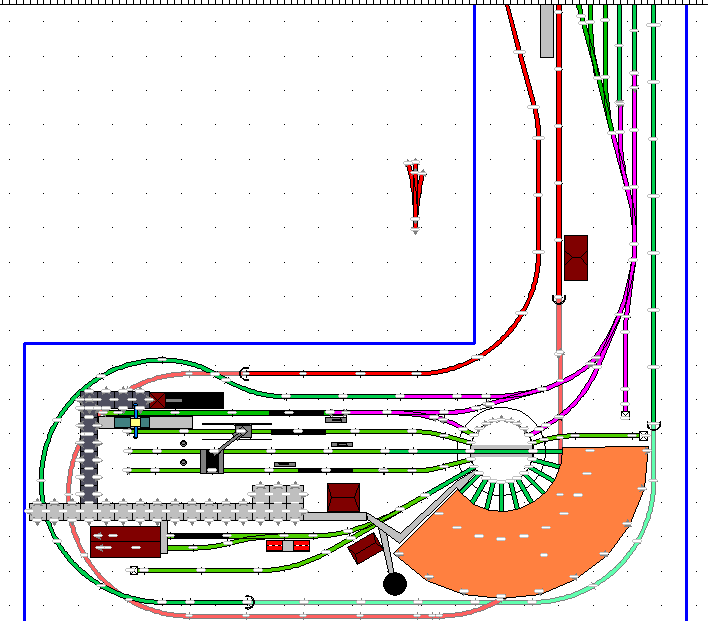 Nie da się trochę skrócić choć odrobinę całego górnego układu 5 torów i podnieść je do góry, żeby zwrotnice różowe 3 i 4 były w osi? Wyprostował by się ten ślepy tor a łuk najazdu na obrotnicę bardziej może wyłagodził (albo raczej bardziej wyoblił w miejsce łączenie ślepego ze zwrotnicą)