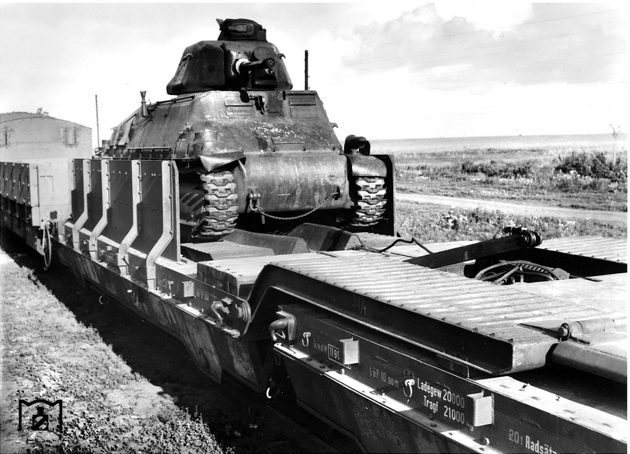 In einem Panzerzug nache Dnjepropetrowsk wird ein französischer Beutepanzer - Typ Samoa S35 - mitgeführt, der bei Bedarf abgesetzt werden kann. (1943) Foto: RVM (Ittenbach)