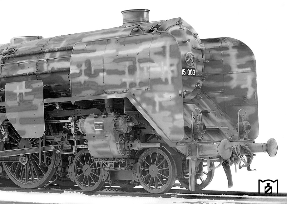 Obwohl Schnellzuglokomotiven vor Kriegsende keine Rolle mehr im Zugförderungsdienst spielten, wurde 05 003 Anfang 1945 bei Borsig in Henningsdorf umgebaut und mit einem Tarnanstrich versehen. (14.02.1945) Foto: Slg. Tiemann