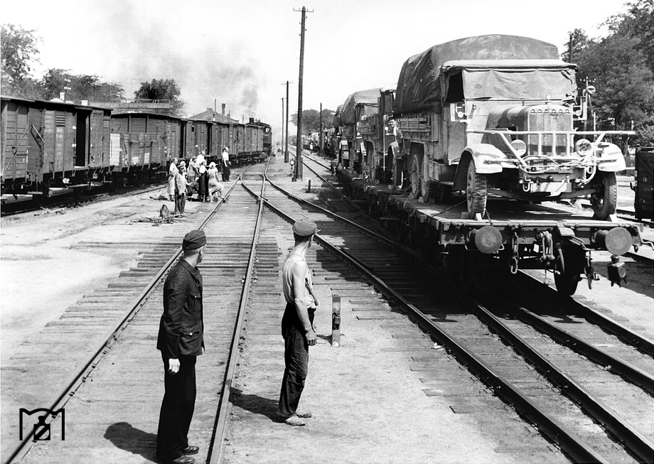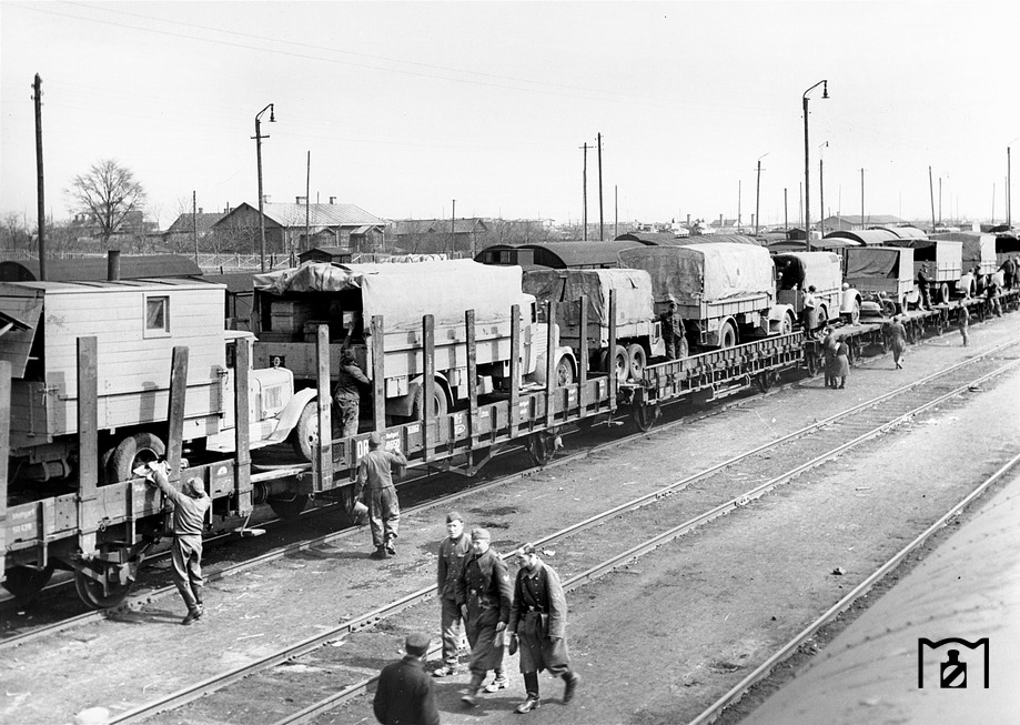Militärtransport mit Wehrmachts-Lkw auf einem unbekannten Bahnhof in der Ukraine. (1942) Foto: RVM (Ittenbach)