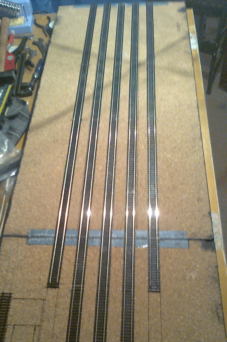 Kolejne zdjęcia to montaż torów, ale zanim to zrobiłem to na początek były przygotowania. Połączyłem dwie skrzynki. Tor przymierzyłem, zaznaczyłem na skrzynce miejsca gdzie wywiercę otwory na przewody, a na szynach miejsca do przylutowania przewodów. Ja najpierw lutowałem przewody do szyn i ciągnąłem za przewód przylutowany do momentu wyginania się szyny (… i kilka razy mi odpadły przewody), a następnie znowu układałem tor na skrzynce sprawdzając czy pokrywają się miejsca przylutowanych przewodów z zaznaczonymi miejscami do wywiercenia otworów. Po korekcie, wierciłem otwory, między nitkami smarowałem klejem (Vicol), wkładałem w otwory przewody i docisnąłem poprzez aluminiowy kształtownik "U" (o czym wspomniał gonzoTTom). Tor długości jednego metra Tilligowego od razu kleiłem na dwóch skrzynkach. Na pierwszej całość, a na drogiej (100-90= 10 cm).