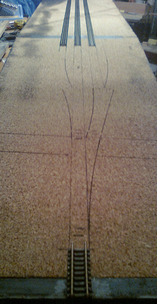 Następne zdjęcia to prace „geodezyjne”. Z uwagi na długość całej stacji (60+90+90+90+90+90+60=570 cm) do wyznaczenia linii prostej użyłem zwykłej nici. Na końcach zaznaczyłem „brzegi” toru i przeciągnąłem przez całą długość stacji nić. Następnie na każdej skrzynce przykleiłem ją, a po wyschnięciu kleju poprzecinałem w miejscach łączenia skrzynek.