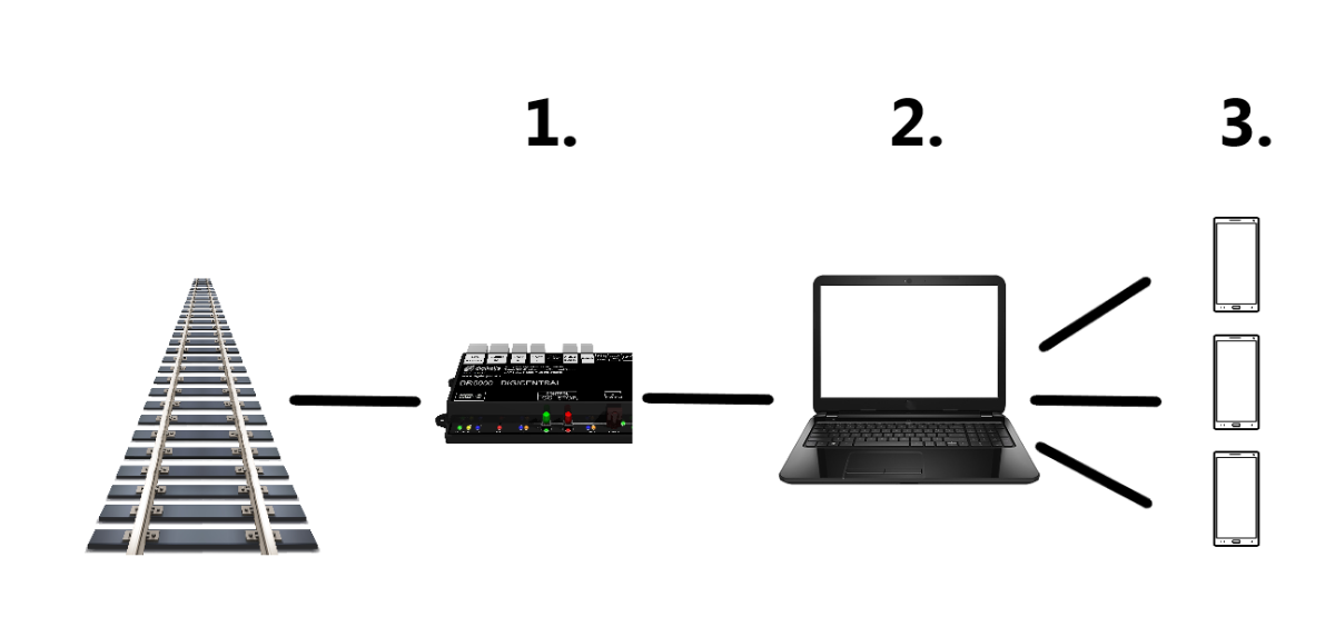 2. Dowolne urządzenie, na którym DigiTrainsPro może działać. Może to być komputer stacjonarny, laptop, tablet lub telefon z dowolnym obsługiwanym systemem operacyjnym. Ważne jest, aby wybrać centralkę DCC, która jest podłączona w punkcie 1 w menu Połączenie tego urządzenia. W menu Ustawienia / Serwer klubu musisz włączyć Club Server.
