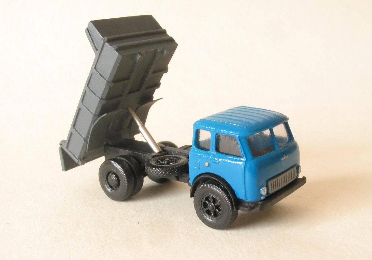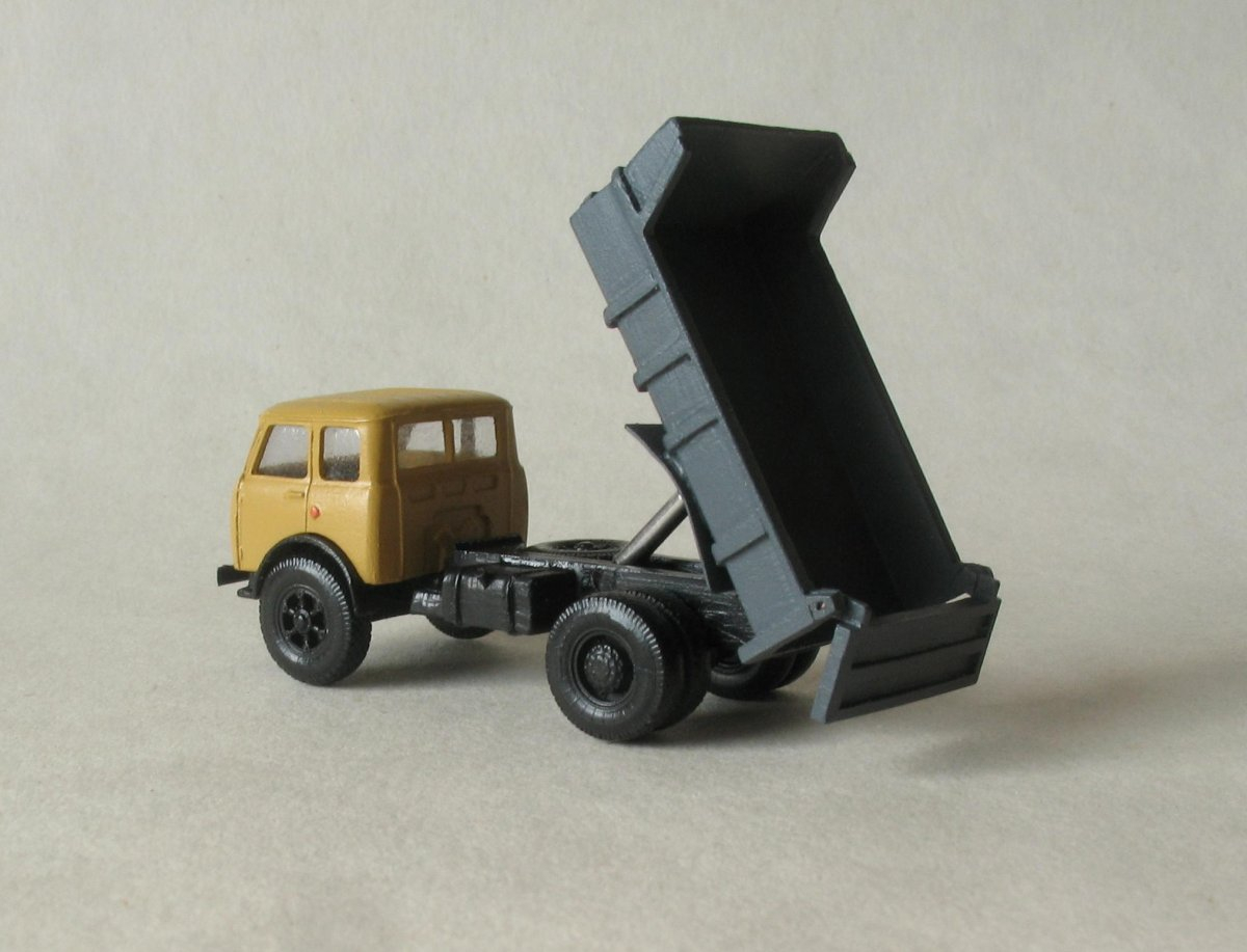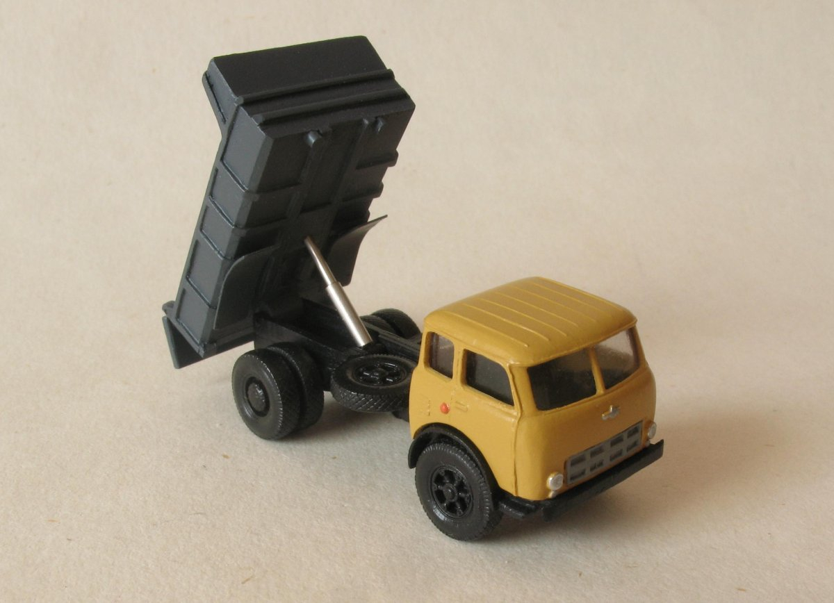 Model jednoosiowej wywrotki. Kipper modelu podnoszony na metalowym dwustopniowym siłowniku, tylna burta uchylna. W kabinie kierowcy umieszczono siedzisko. Model wyposażono w typowe dla tej wywrotki chlapacze, tzw. brwi. Do ramy, tak jak w oryginale zamontowano na płasko zapasowe koło. Przez szereg lat można było spotkać wywrotki MAZ 500 na naszych drogach. Niestety nie jestem w stanie dokładnie określić w jakich malowaniach występowały te pojazdy.