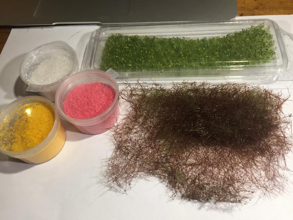 Ogródek jest kwietny, bez warzywa. Kwiecie od Martina Welberga, najwięcej łodyg to kępki trawy 12 mm brązowej plus jakiekolwiek liście. Trochę Silhouette bodajże 920 albo podobny. Generalnie "na winie", czyli wszystko, co się nawinęło.