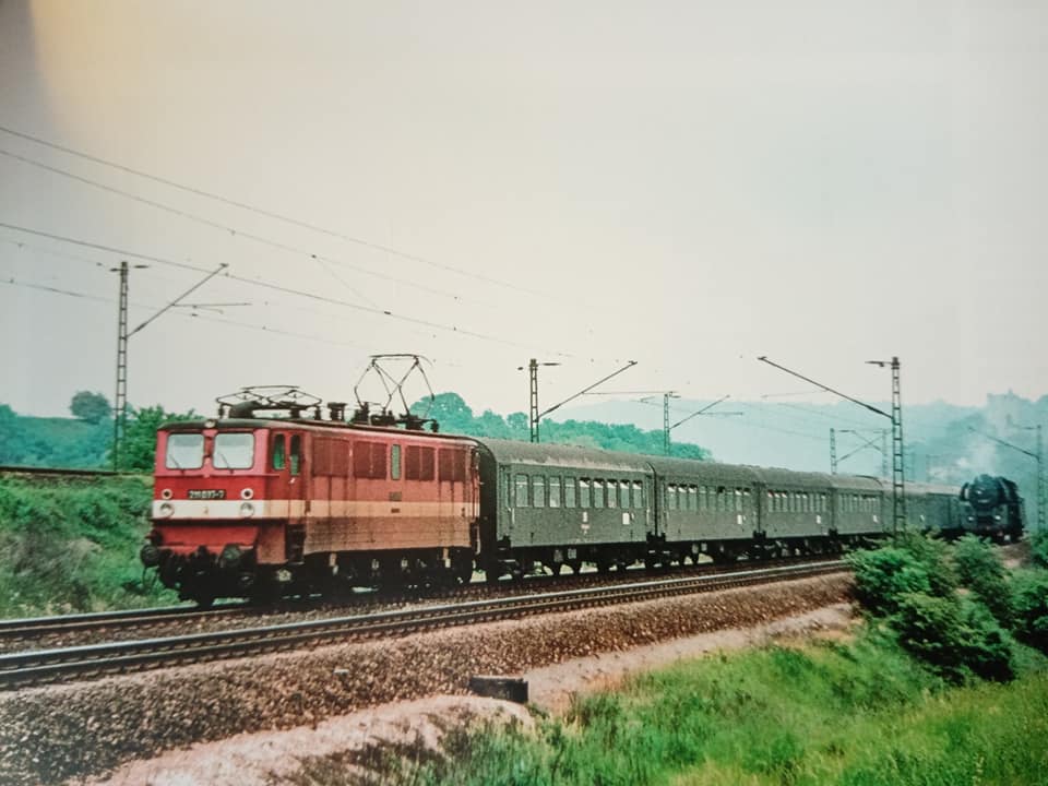 "Z serii model i oryginał czyli elektryk E42 079 Tilliga. Na fotce oryginał fabrycznie nowy z pociągiem pospiesznym międzynarodowym z Drezna do Monachium na stacji Karl - Marx - Stadt w trzeciej epoce, 1966r. Model zakupiony do kolekcji od kolegi z Wielkopolski. Jeden z pierwszych tej loki zrobionych przez dobrego jeszcze wtedy Tilliga."