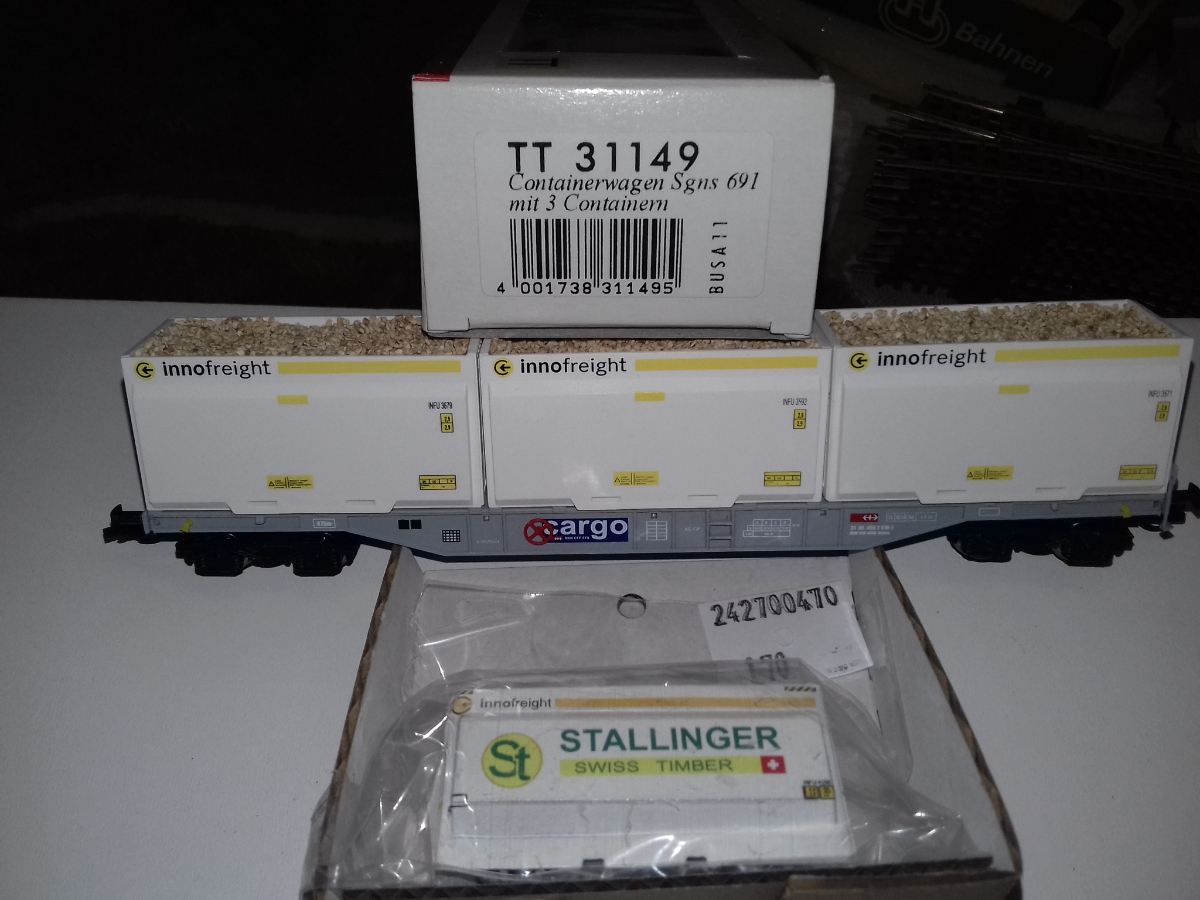 56.BUSCH 31149 (wagon platforma z 3 kontenerami 20' - inny numer wagonu)plus dokupiony kontener SBB w innym malowaniu.