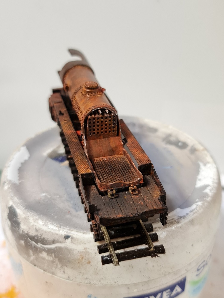 Sporo zależy od pokładu, kocioł był pomalowany aerografem tą samą farbą co hamulce (71.033). Po nałożeniu pigmentów które są mega niestabilne i wystarczy przypadkowe dotknięcie żeby je zetrzeć na wszystko poszedł z aero matowy lakier. Trzeba też tu poeksperymentować bo lakier strasznie tłumi pigmenty. Pomimo że to najbardziej matowy mat jaki miałem to i tak po tym jak wysechł świeciło się jak wiadomo przysłowiowe co. Wiec na ten lakier jeszcze trochę pigmentów nałożyłem. Farby jakich używam to akryle vallejo model air. Pigmenty nakładane jakimś starym pędzelkiem 000 z którego zostało kilka włosków tak żeby na raz za dużych plam jednolitego koloru nie narobić ale w razie czego można zetrzeć