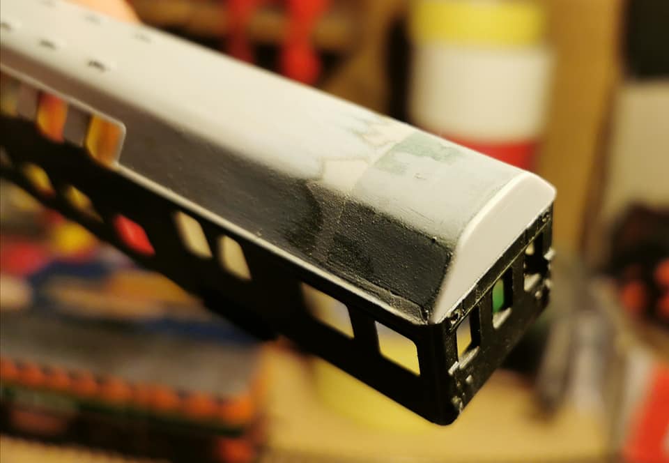 Teraz czas na montaż zderzaków i pokryw sygnałów końca pociągu (produkt OSTBAHNa), domalowanie czołownic na czarno i rączek na drzwiach na srebrno i malowanie lakierem matowym.