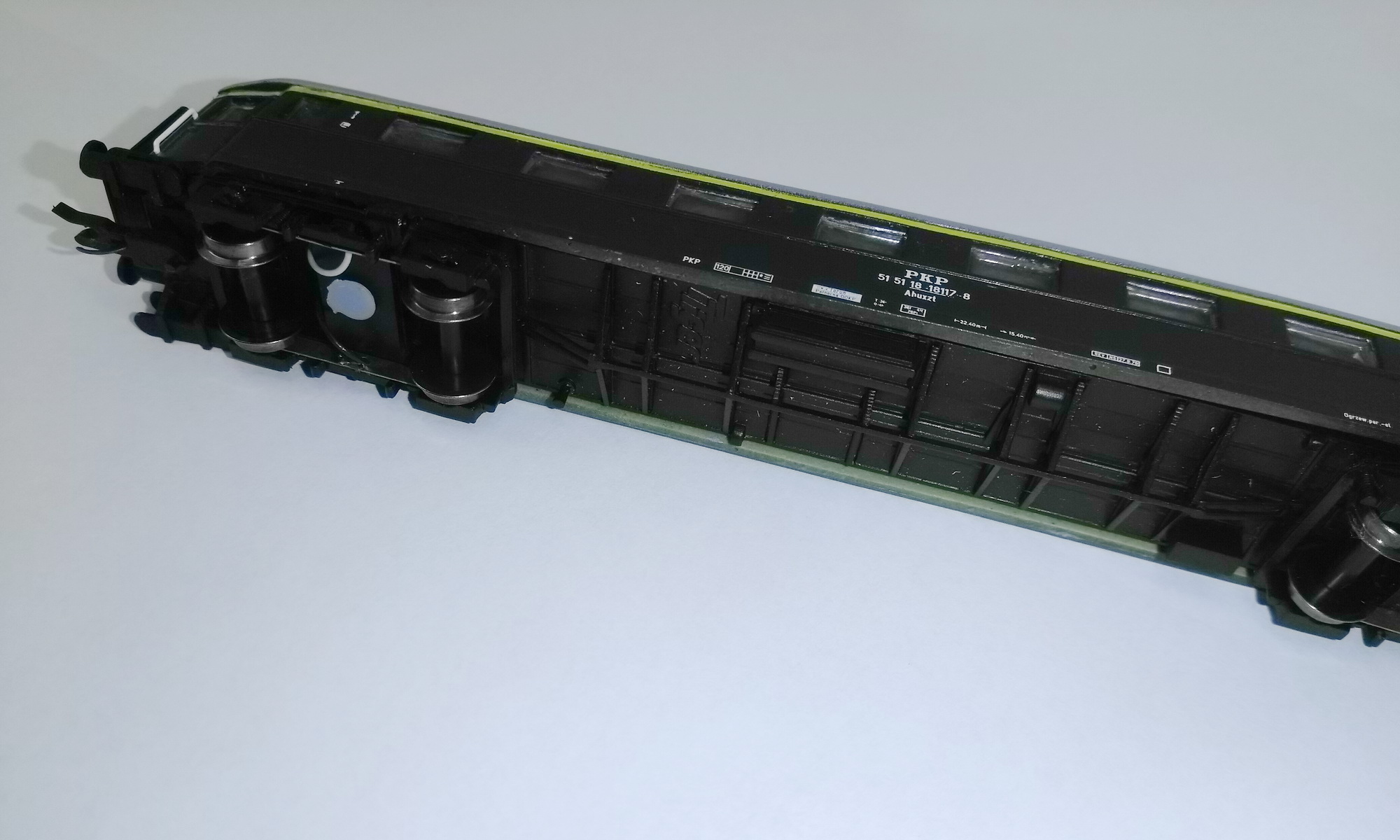 Wagon sprzedawany jako gotowy, bez oświetlenia ale przygotowany do jego założenia (koła Peho, każde zbiera prąd, z wózków idą założone przewody do wnętrza wagonu), kinematyka Peho. Odnośnie oświetlenia będą informacje czy podchodzi coś uniwersalnego czy pojawi się dedykowane - ale to akurat chwilkę potrwa.