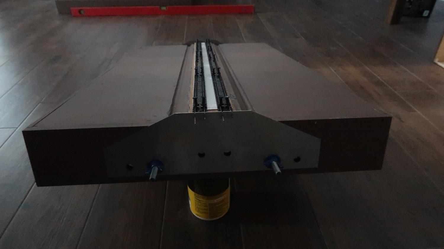 W celu właściwego, bardzo dokładnego umieszczenia końcówek szyn na profilu czołowym, użyłem szablonów wyciętych laserowo z stali nierdzewnej. Szablony pozycjonują szyny w obu płaszczyznach względem otworów służących do skręcania modułów między sobą. Dzięki temu podczas łączenia dowolnych modułów z takim profilem, oba tory powinny idealnie pasować do siebie.