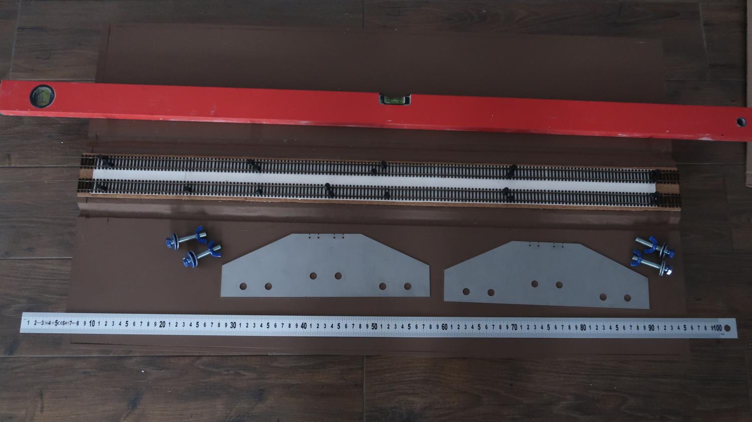Tory należy układać w taki sposób, aby były proste zarówno wzdłużnie, nie falowały na boki, tak aby nie powstawały niepożądane pagórki oraz aby żadna z szyn nie była wyżej od drugiej. W tym celu wykorzystałem przymiar stalowy, linijkę aluminiową, poziomicę. Każda niedokładność w geometrii toru to miejsce na makiecie, w którym potencjalnie tabor może się rozprzęgać podczas jazdy.