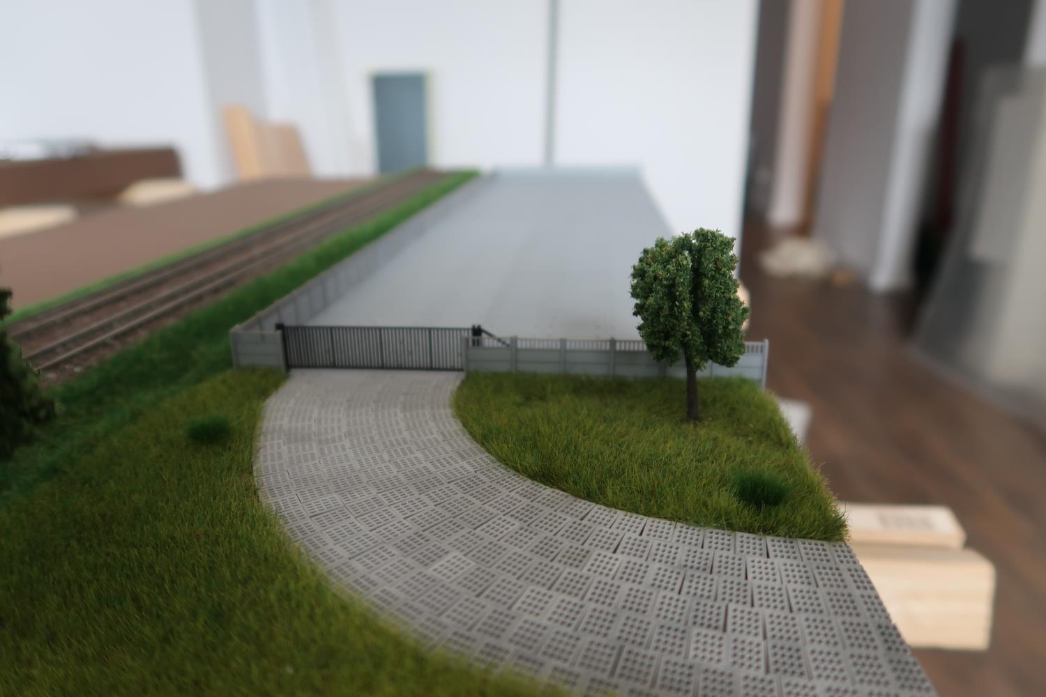 Dorobiłem kolejny moduł 300 mm długości, zwężający się z 500 do 300 mm. Moduły szlakowe często mają mniejszą szerokość niż stacyjne i powstaje uskok na granicy modułów. Mała wstawka z przejazdem kolejowym zniweluje tą niedogodność.