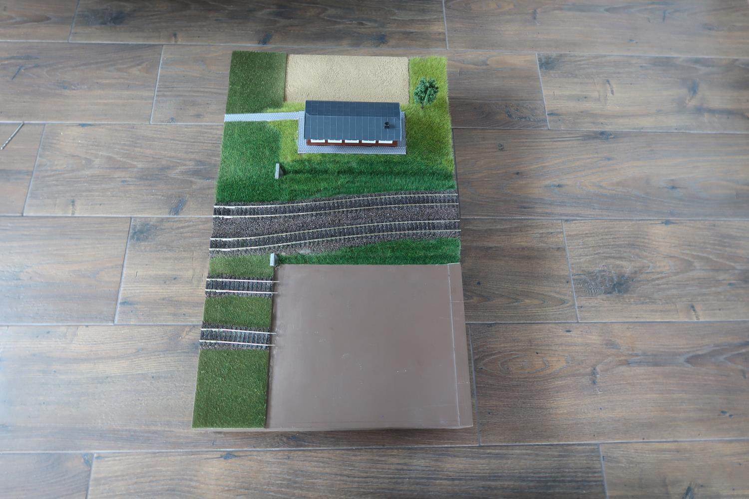 Na zdjęciach załapał się również moduł przejściowy 300 x 500 mm z nastawnią. Moduł miał za zadanie „zwęzić” rozstaw między torami z 43 mm na szlakowe 36 mm oraz umożliwić podłączenie korytek zjazdowych do stacji technicznej.