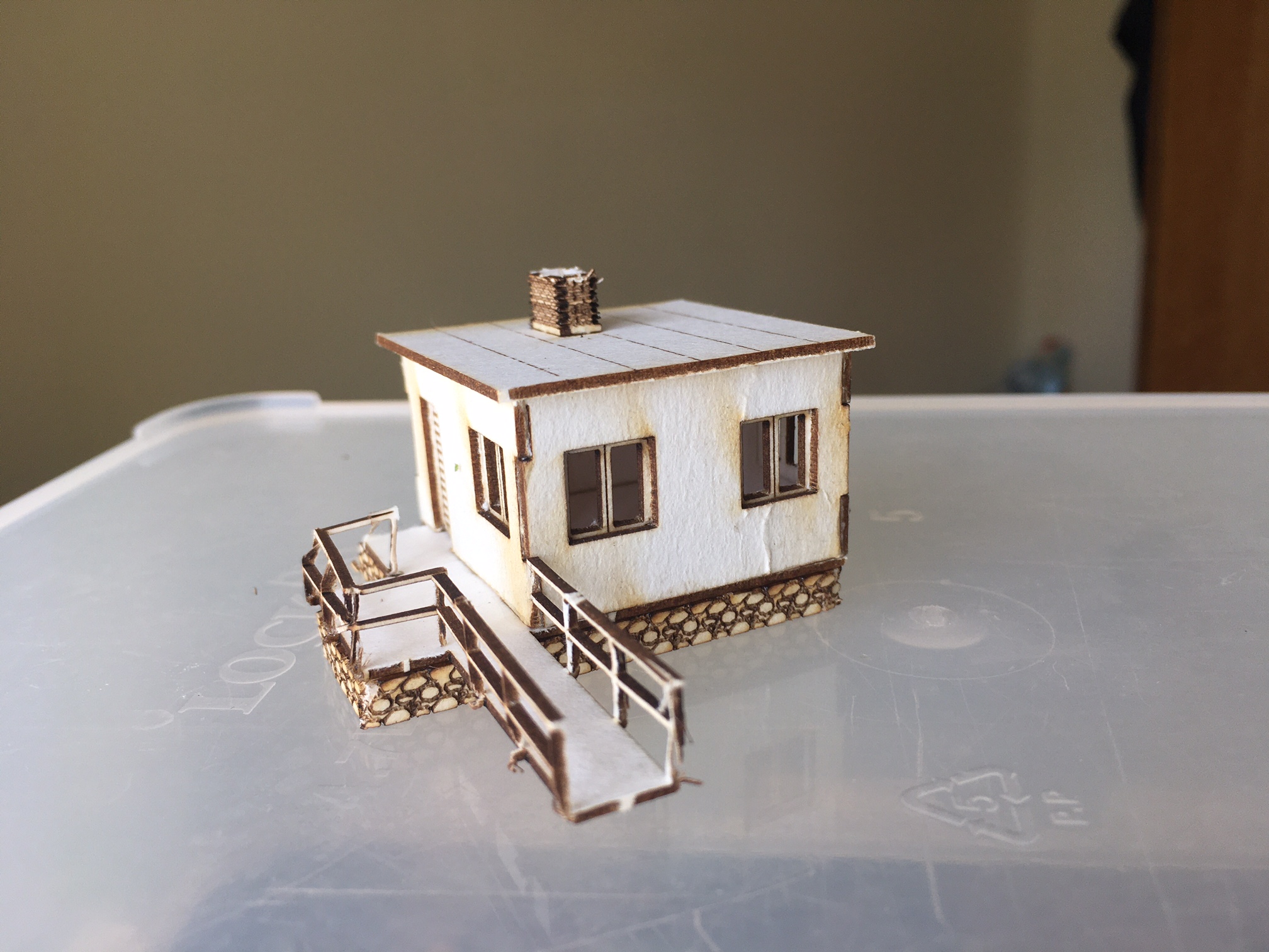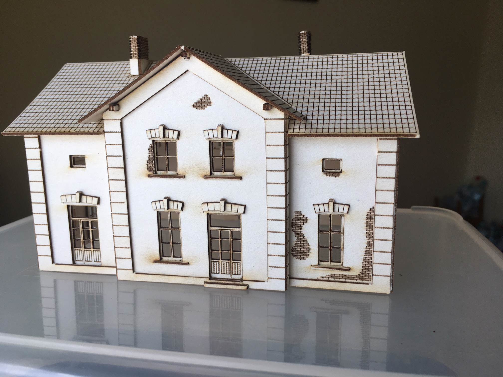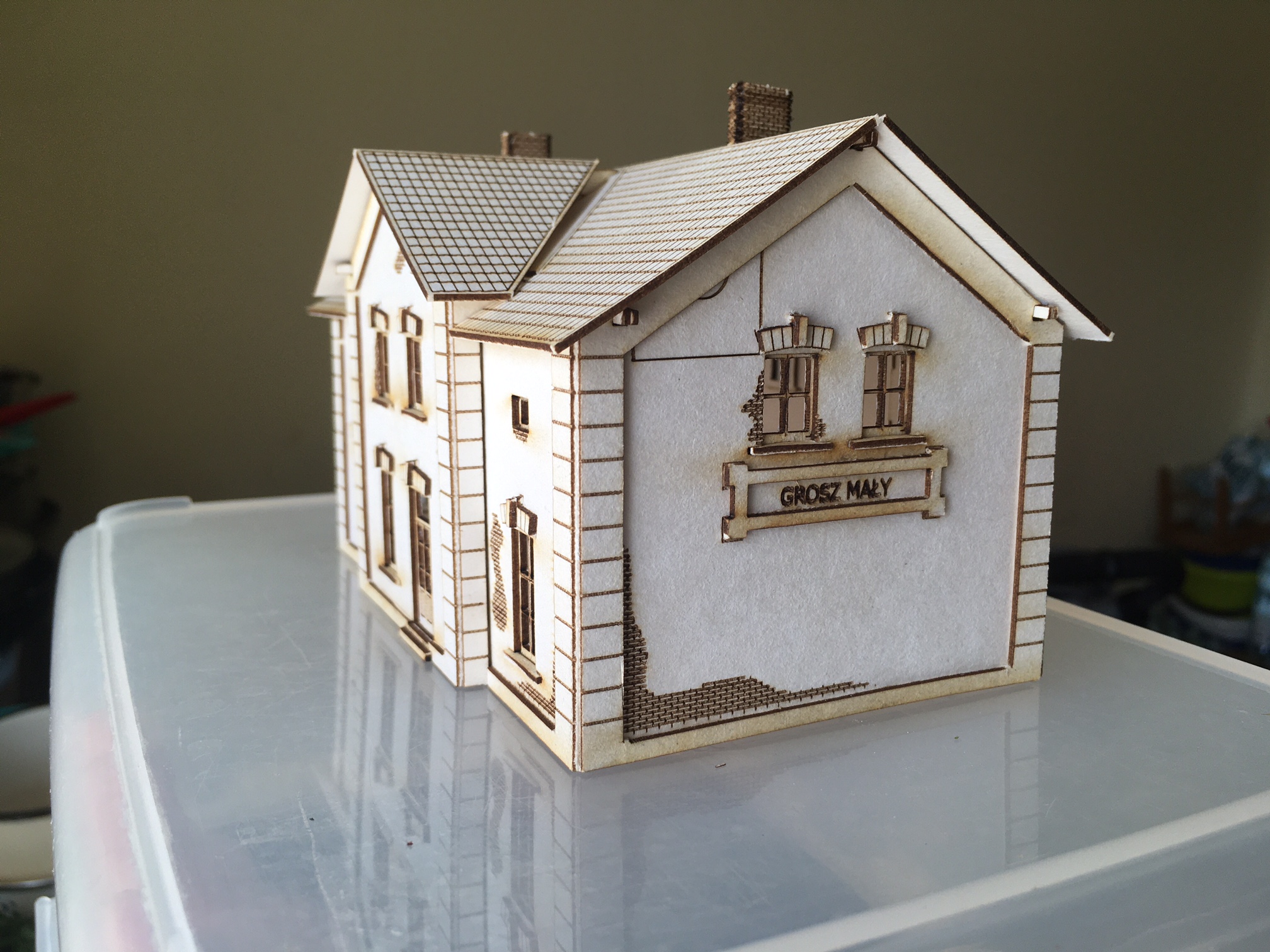 Budynek stacyjny i nastawnia w wersji testowej, czy da się to poskładać. Do poprawy dach, kominy i poręcze.