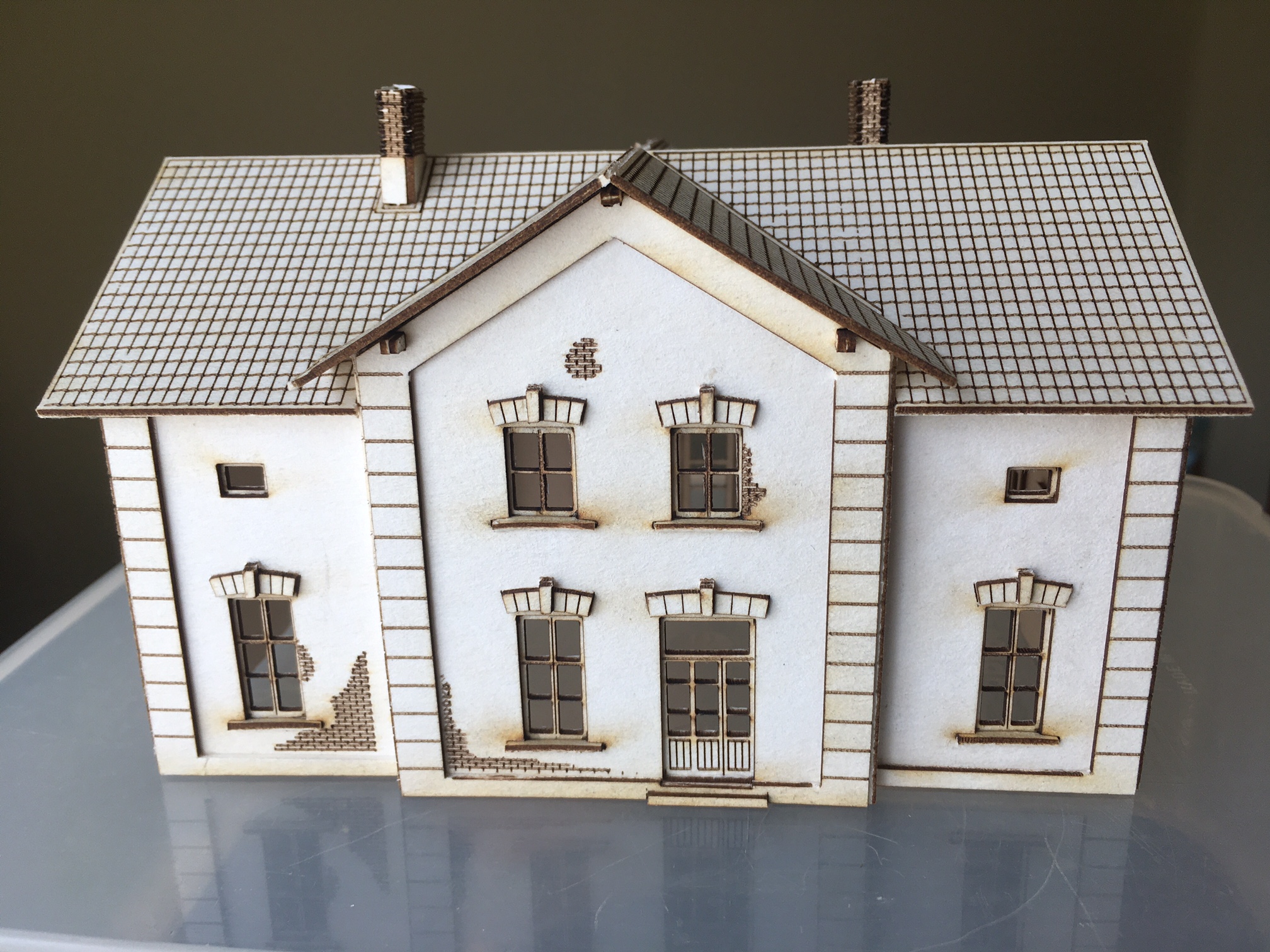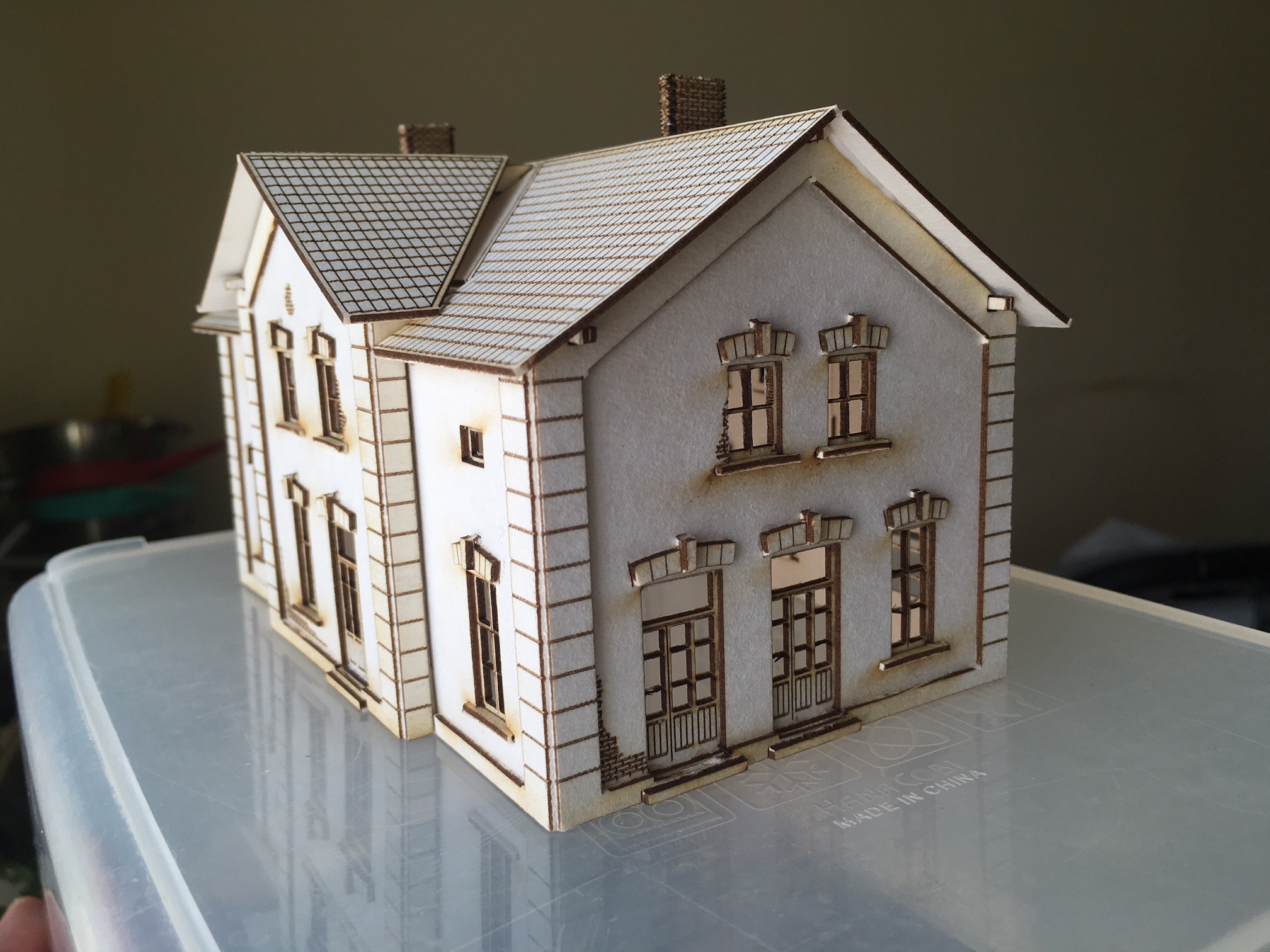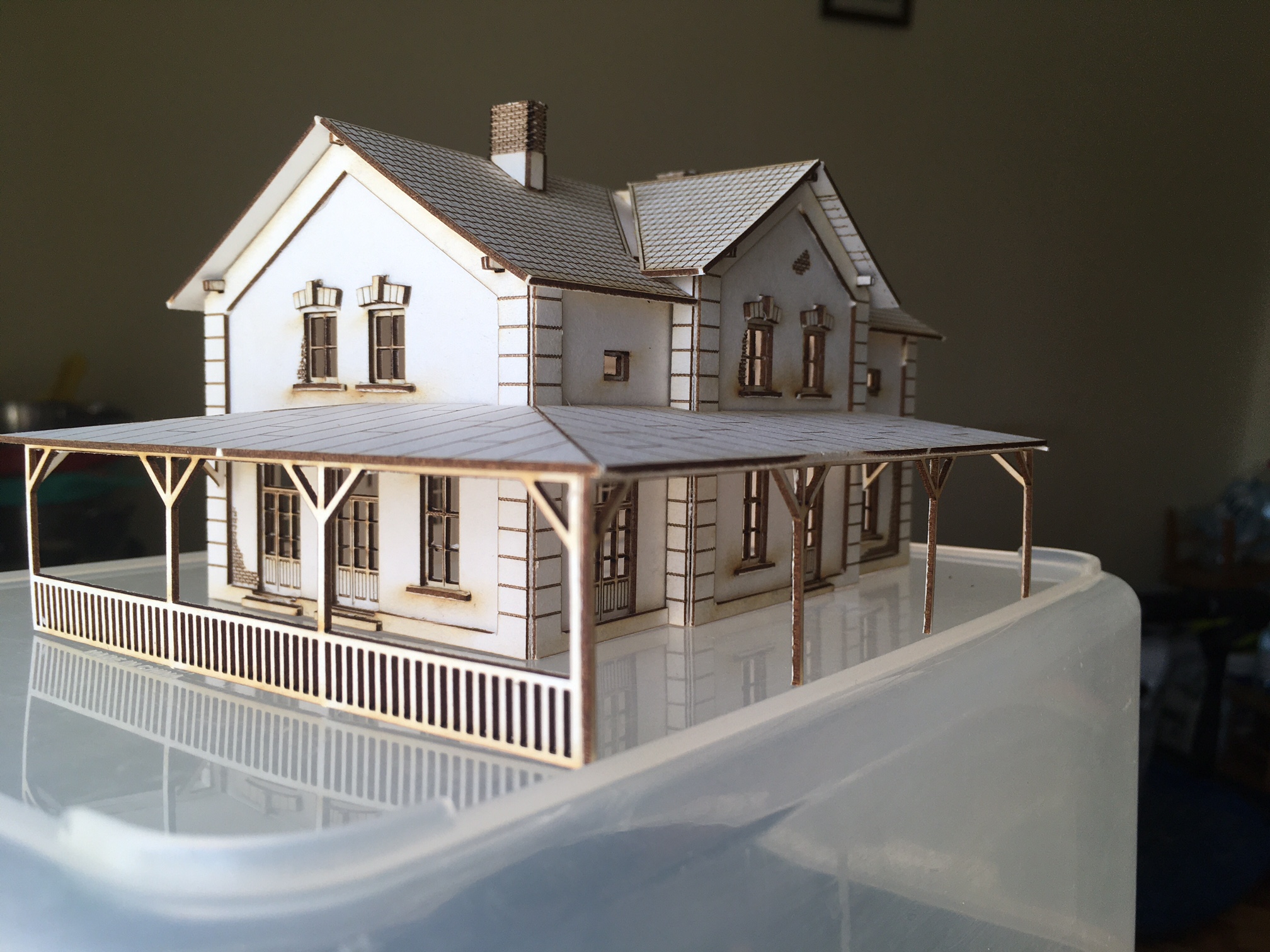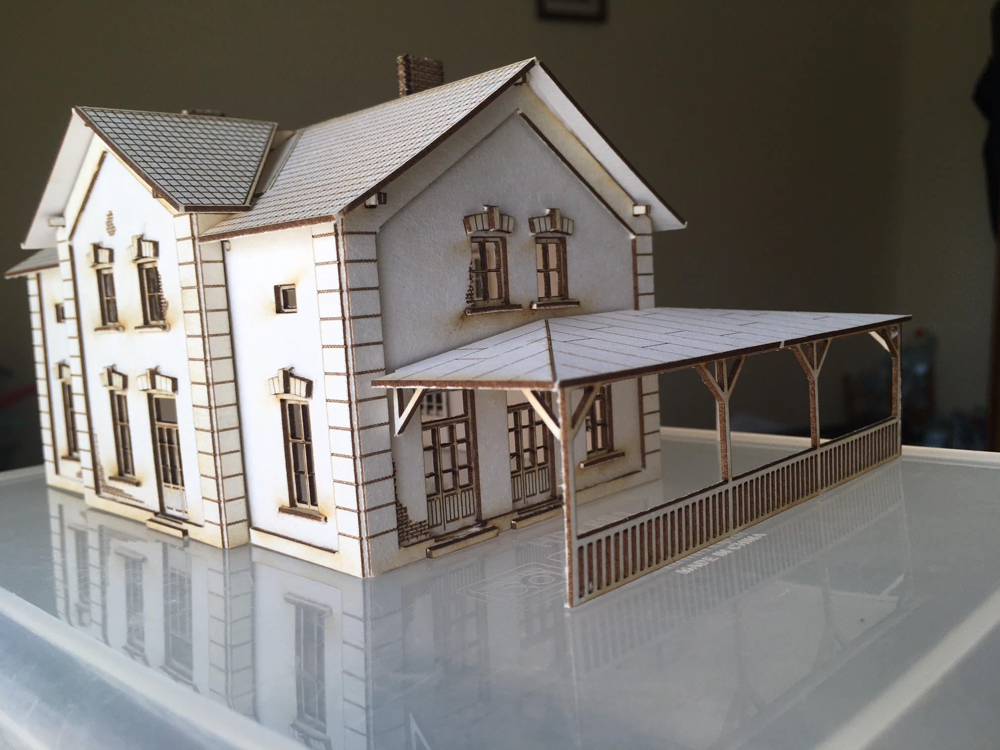 Budynek stacyjny i nastawnia w wersji testowej, czy da się to poskładać. Do poprawy dach, kominy i poręcze.