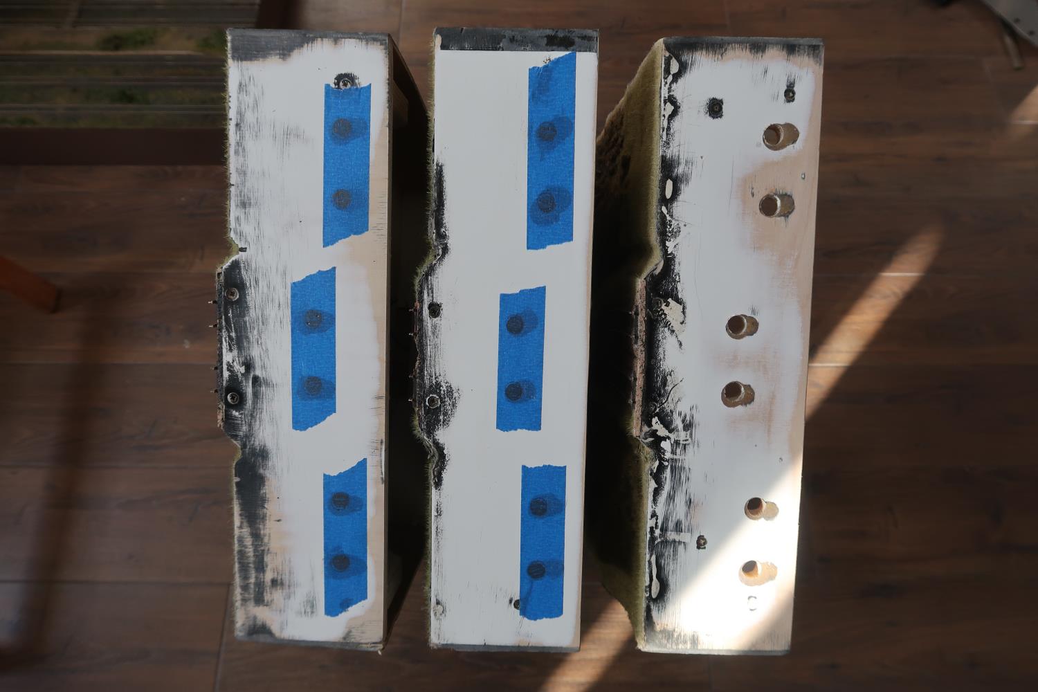 Otwory zostały podklejone od spodu taśmą malarską i wypełnione żywicą dwuskładnikową. Żywica ma tendencję do kurczenia się podczas zastygania, dlatego wylewałem w dwóch etapach. Po zastygnięciu żywicy i jej oszlifowaniu wykonałem nowe otwory według profilu standardowego. Wymiarowanie otworów warto wykonać na naklejonej wcześniej taśmie malarskiej.