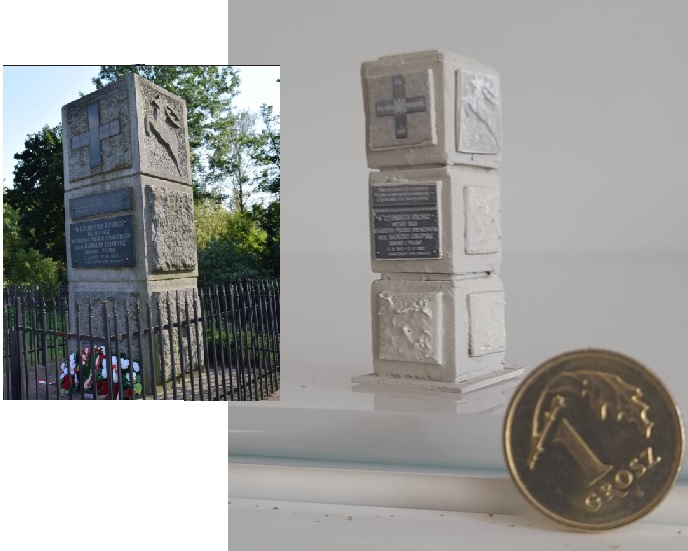 Napisy i ten Jeleń.... no cóż.... Pomimo, że jeleń wydaje się 3D, to wydruk ze zmniejszonego zdjęcia z pomnika z cieniami. Napisy na czarnej płycie - też pomniejszone zdjęcie. Wydruk na kolorowej laserówce na papierze do drukarki i potem wycięte i naklejone na model pomnika. Potem całość podrasowałem farbkami w kolorze betonu by nie było za bardzo widać krawędzi białej kartki. Ot co.
