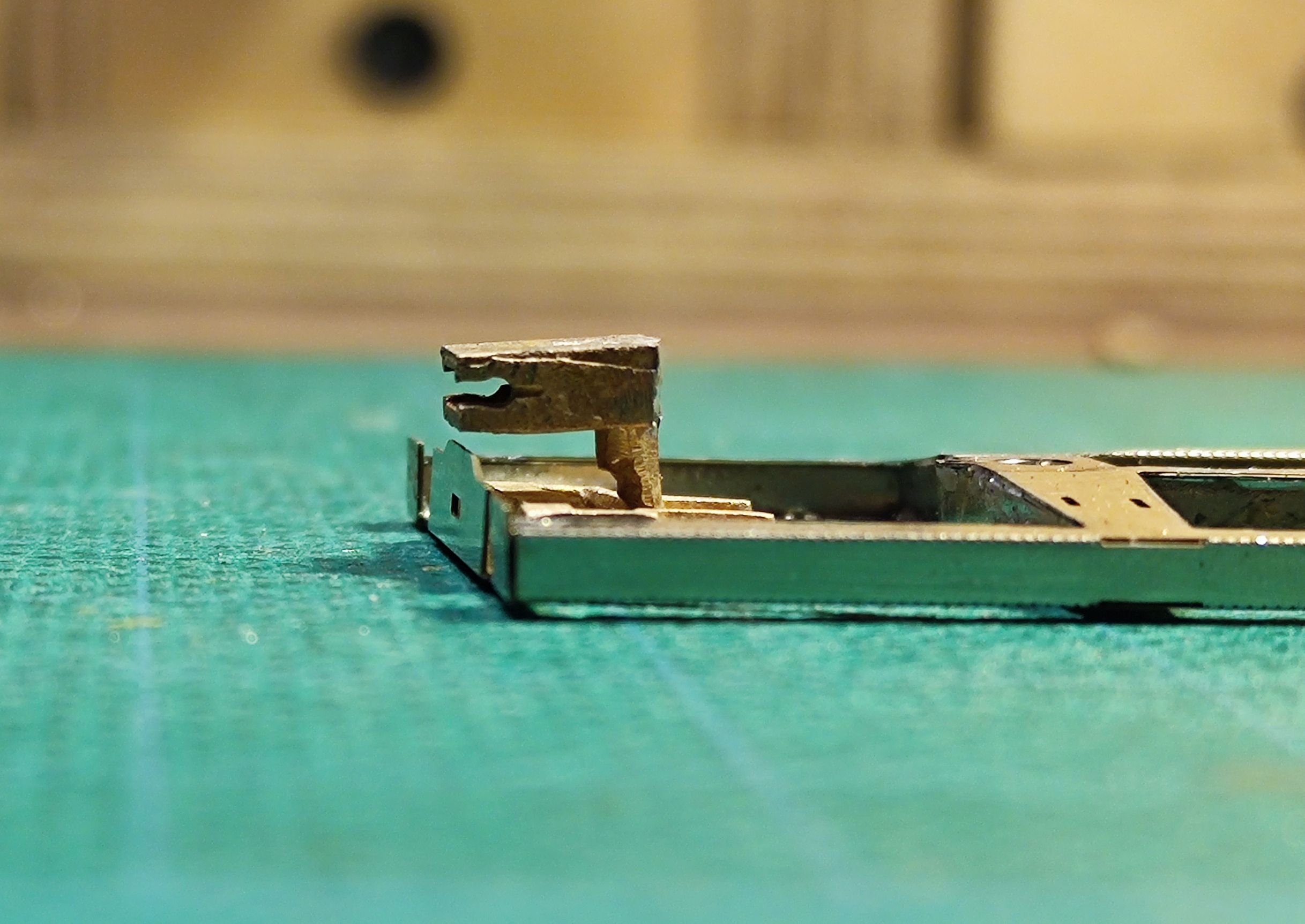 Podnosimy tablice przestawcze oraz wspornik poła hamulcowego. Wszystko delikatnie wzmacniamy lutem.