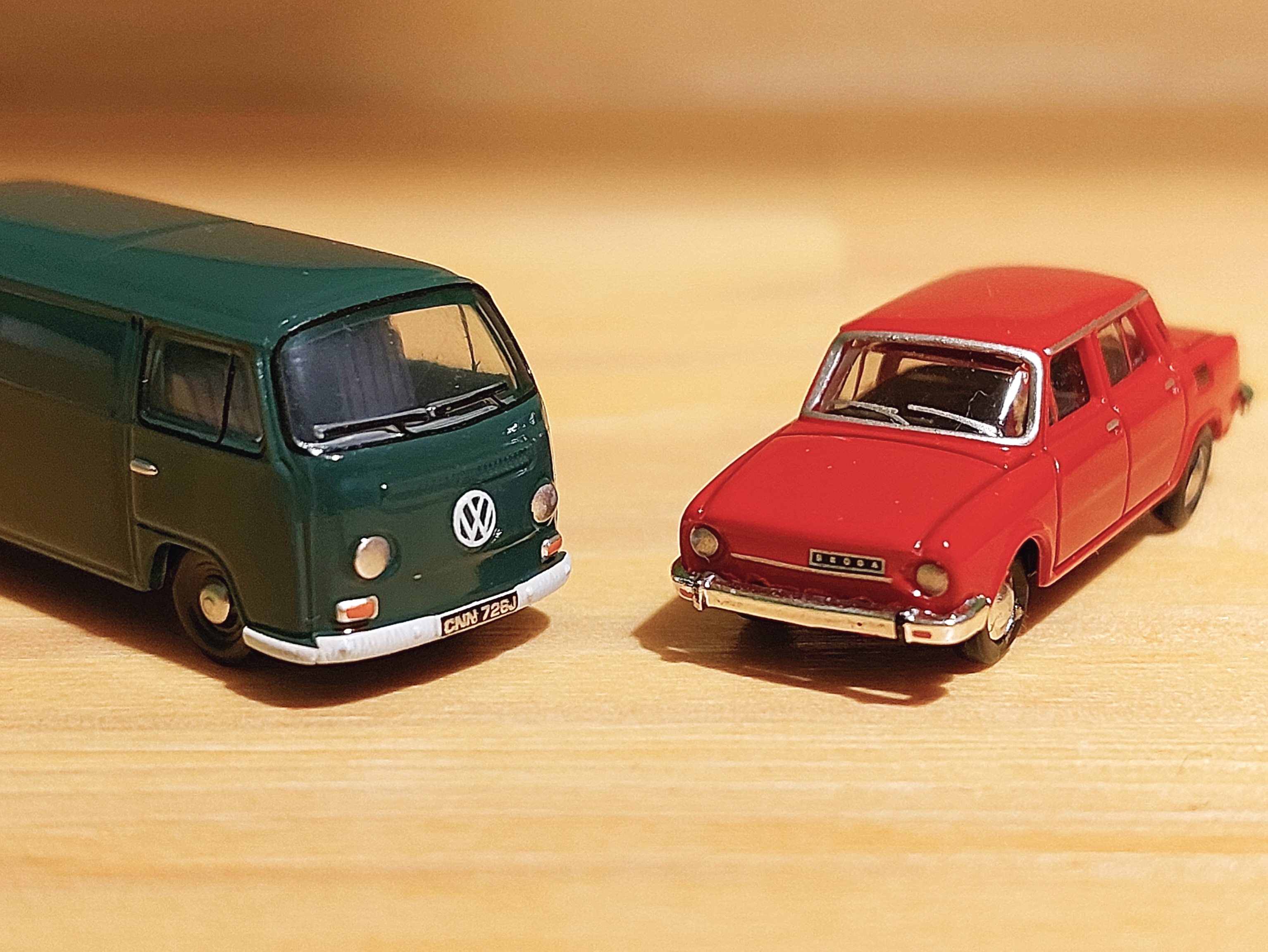 Jeżeli chodzi o same modele - uważam, że to jak dotą najlepsze modele seryjne pojazdów w wielkości TT. Oczywiście zrozumiałe, że ze względu na swoją specyfikę nie wszystkie mogą wydać się interesujące ale nie zmienia to mojej oceny. Jakoś lakieru i nadruków i ogólne proporcje chyba jednak lepiej w tej wielkości udaje się uchwycić OXFORDowi niż niemieckiej firmie HERPA, która jest jak dotąd największym oferentem dobrych modeli pojazdów w TT. Dla porównania - dwa zdjęcia zestawiające VW Transportera (T2) od OXFORD oraz Skodę 110 od HERPA (oba model licencjonowane :P ). Porównanie moim zdaniem wypada korzystniej dla OXFORD (chromowane ramki kierunkowskazów, uszczelki również okien bocznych, rejestracja itp) ale oczywiście zdania mogą być różne. Oczywiście - na całość należy brać poprawkę że zdjęcia są w trybie makro co uwydatnia wszelkie niedoskonałości a same modele mają ok 1cm szerokości...