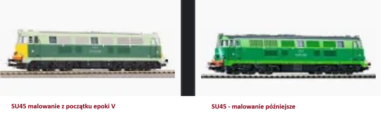 piottrw pisze: 04 paź 2023, 21:07 MTB robi modele SU45 po przebudowie z SP45 i wyposażeniu w gniazda na czole, malatura jest z epoki 5, po 2002 roku kiedy zrezygnowano z żółtych czół. Oba warianty kolorystyczne są prawidłowe. Te lokomotywy w 4 epoce jeszcze nie istniały.