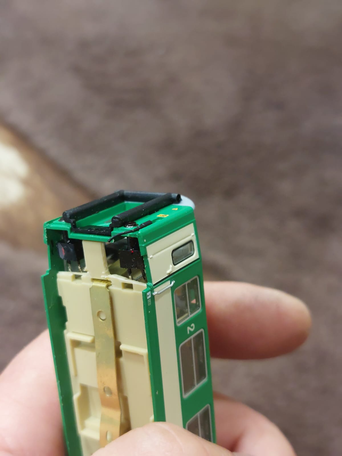 Teraz jest za wysoko, ledy nie wypadną na wysokości końcówek, tylko wyżej (końcówki są pod podłogą (żółta wypraska wnętrza). Tam między tą podłogą a ścianą końcową wagonu jest tyle (lub prawie tyle) miejsca, aby wcisnąć tę listwę z końcówkami - powinna oprzeć się o wystające do środka wagonu przejście międzywagonowe - tam można listwę podszlifować na gładko, aby niżej siadła, widać wyraźnie niedokładność cięcia fabrycznego (inaczej może haczyć o dach wagonu). Jeśli jest problem z wciśnięciem, to można podszlifować żółtą podłogę wagonu na końcach, ale nie więcej, niż o dziesiąte części milimetra.
