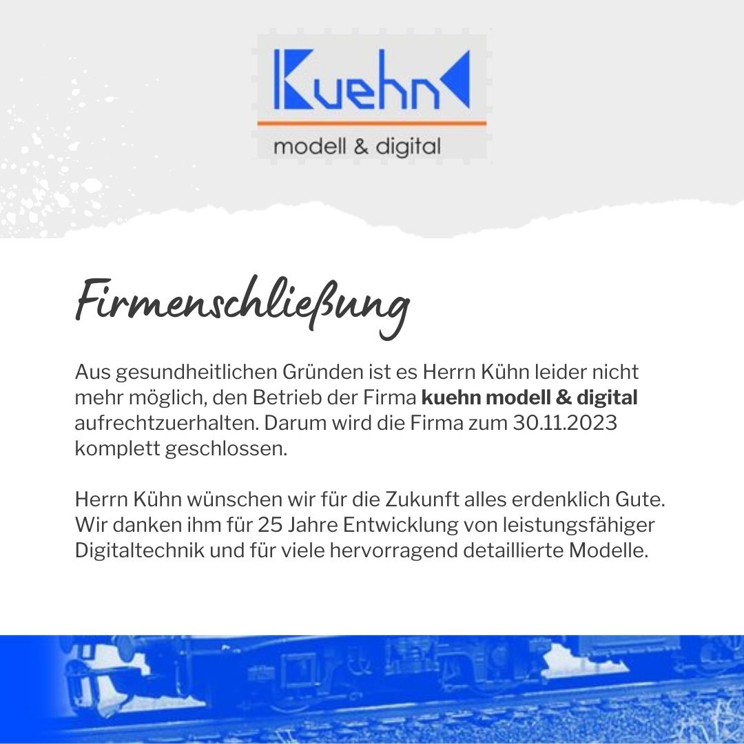 Niestety ze względów zdrowotnych nie jest już możliwe, aby Pan Kühn utrzymywał działalności firmy Kuehn model & digital. W związku z tym 30 listopada 2023 r. firma będzie całkowicie nieczynna.