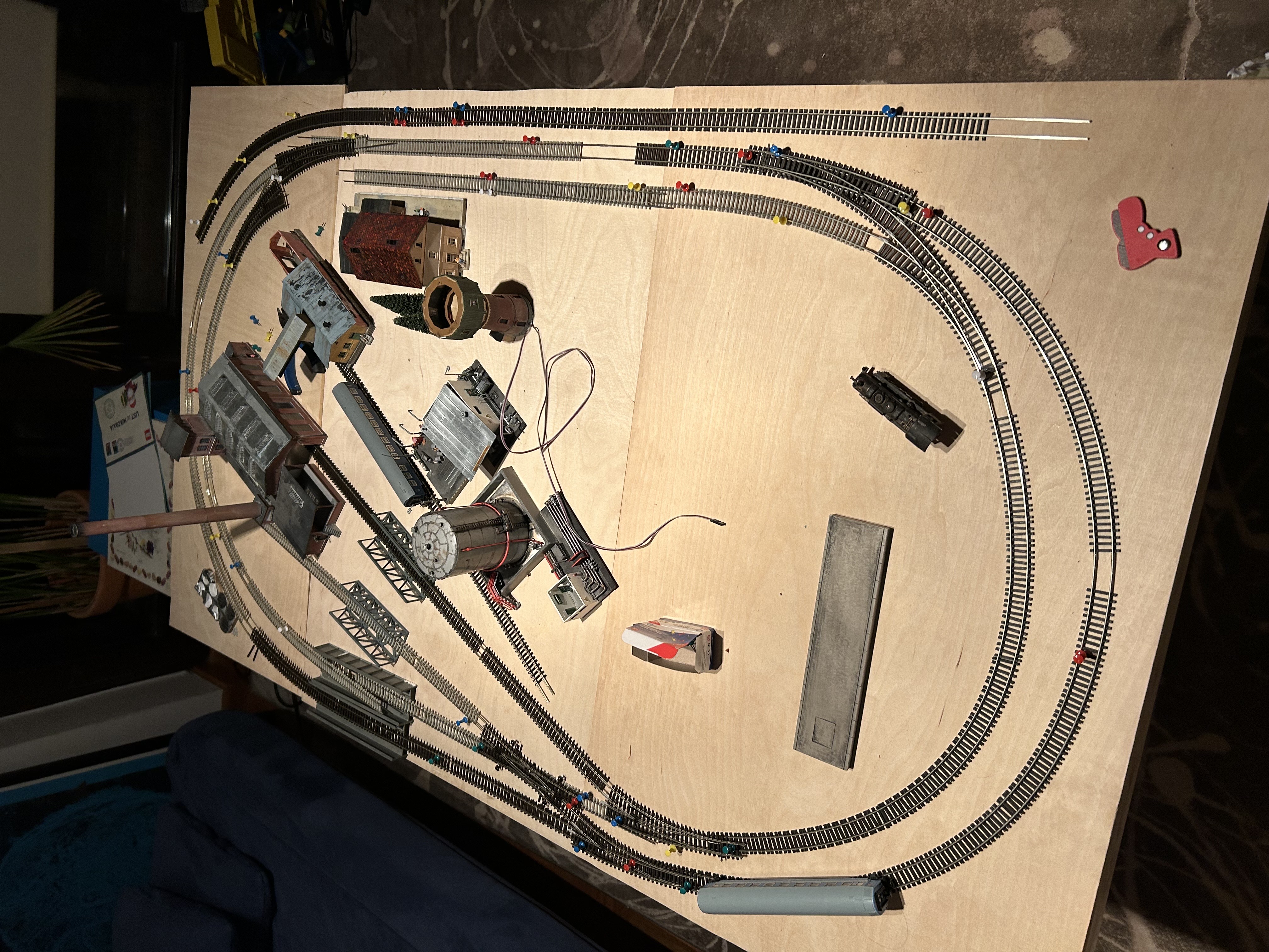 Makieta 2 poziomy - perony i dworzec na górze, zakręt i tor boczny na dole (wewnętrzny tor ma zbyt duży promień skrętu). Szare tory z dworca powinny być na tym zdjęciu na górze, ciemne na dole.