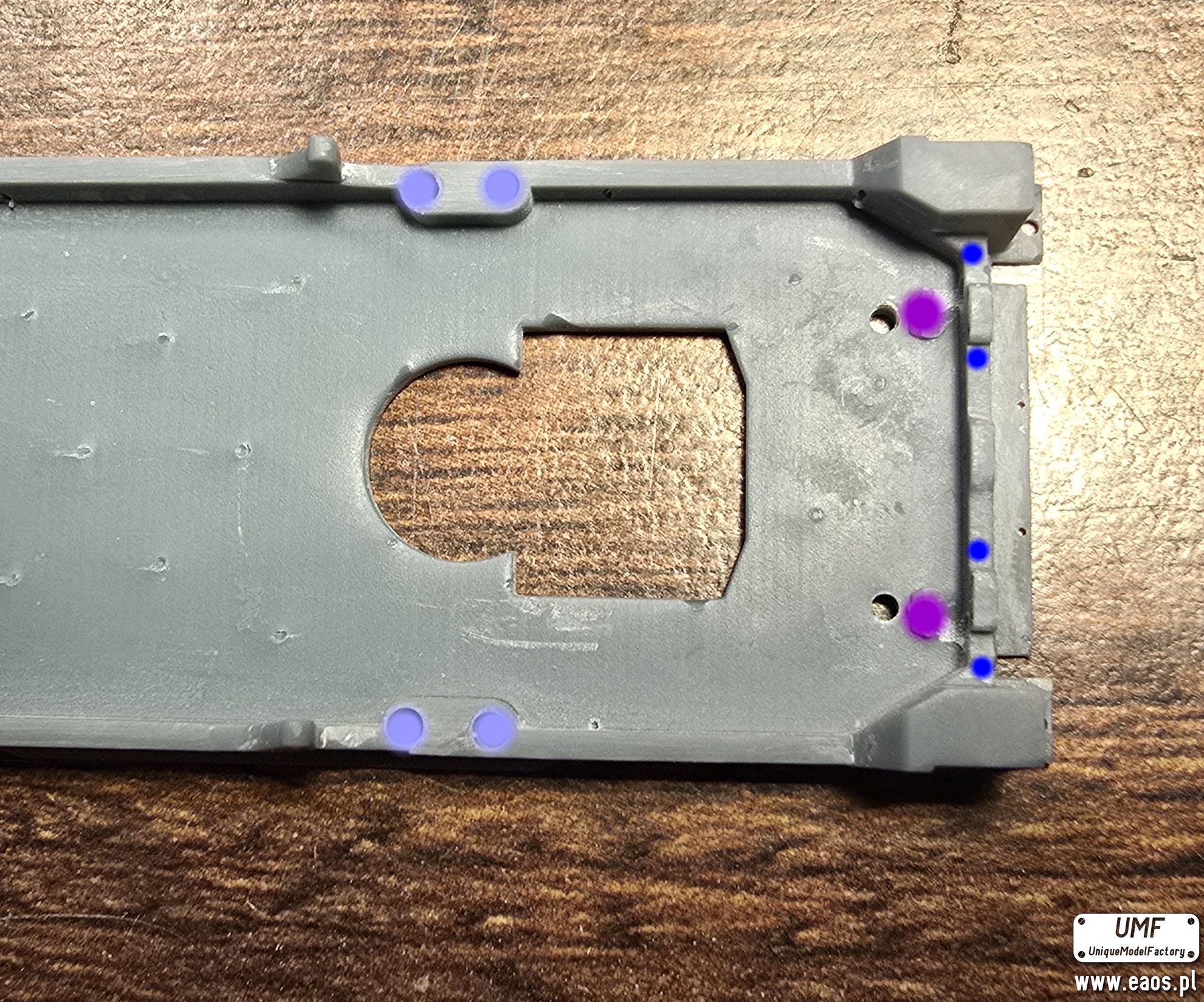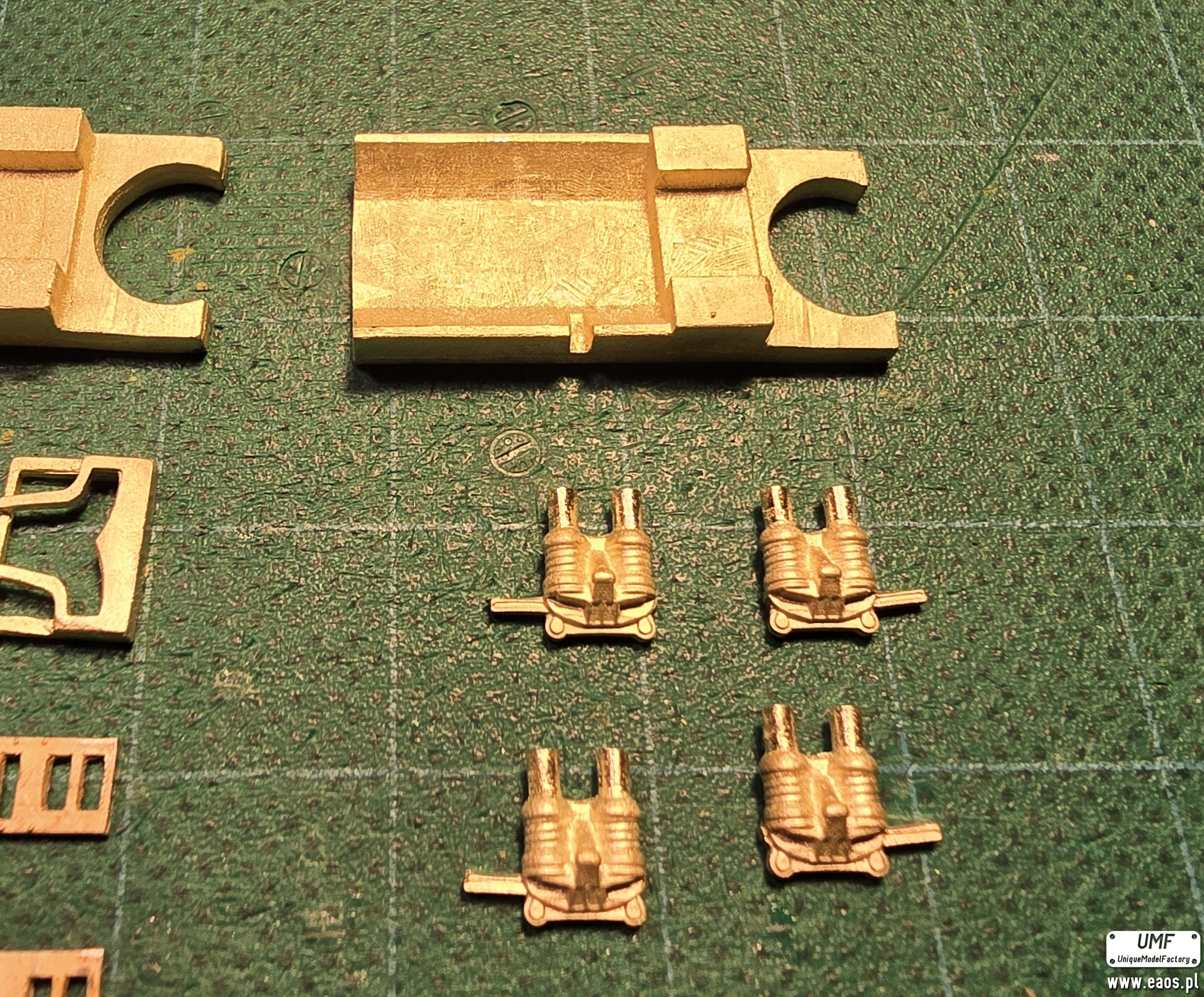 :arrow: Metalowe odlewy montujemy tak samo jak w przypadku wersji żywicznej z tym, że ja posłuchałem się Wojtka i montuję do malowania tylko sprężyny, schodki, reflektory i podstawy silnika. Reszta po malowaniu bo łatwiej maskować i wszystko ładnie wymalować.