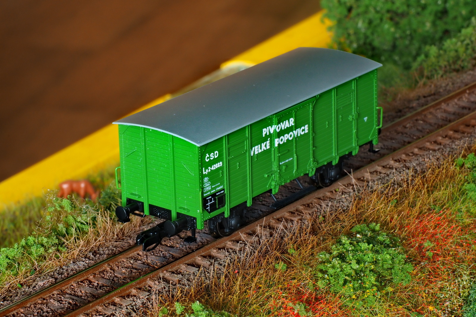 wagon kryty typu G02 w barwach browaru Velké Popovice (ČSD, epoka III, PIKO nr kat.: 47769)