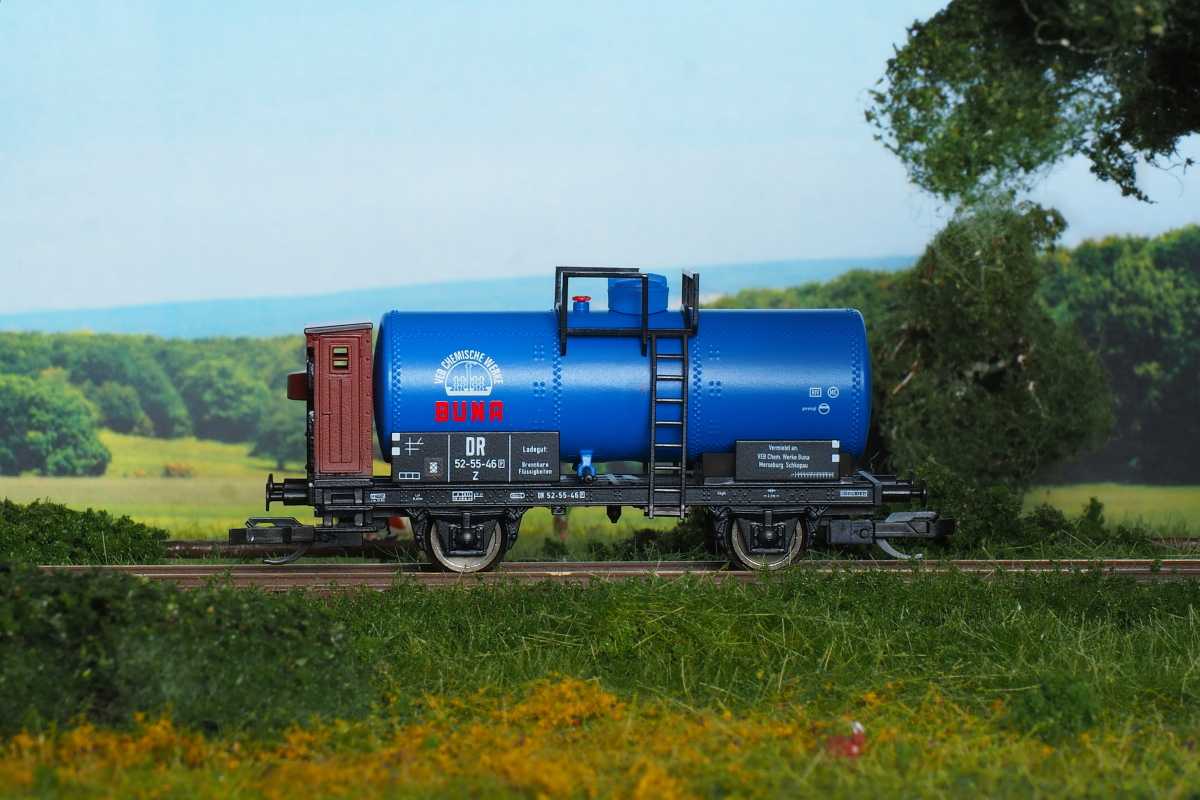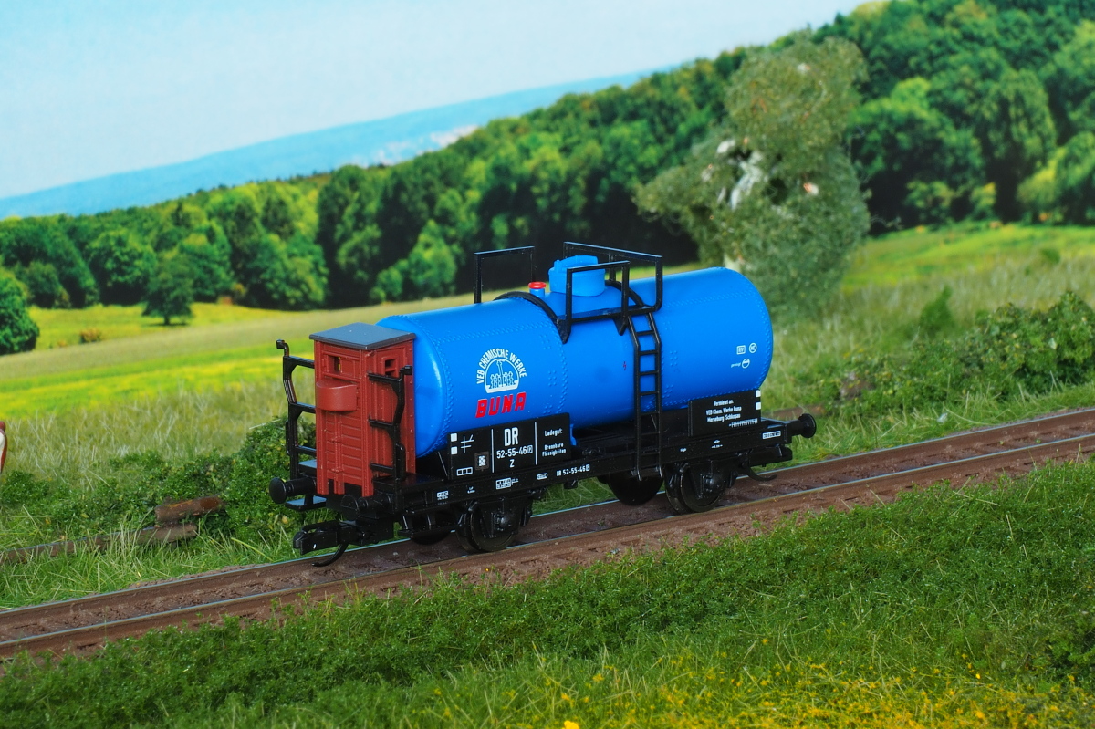 dwuosiowy wagon cysterna z budką hamulcową w barwach "VEB Chemische Werke Buna" (DR, epoka III, Tillig nr kat.: 95861)