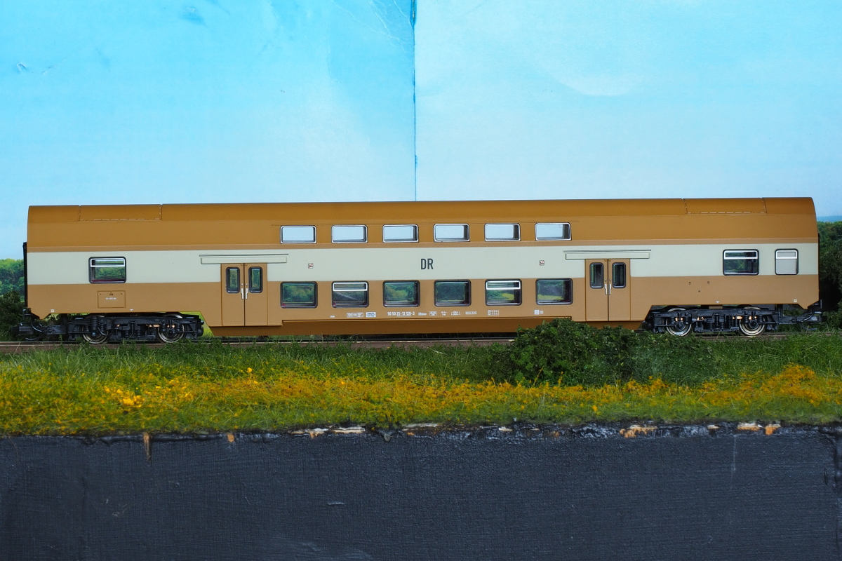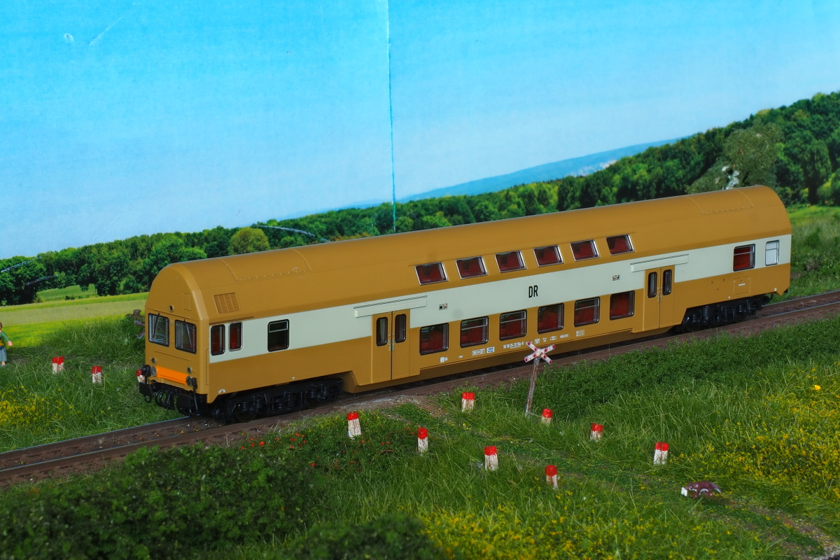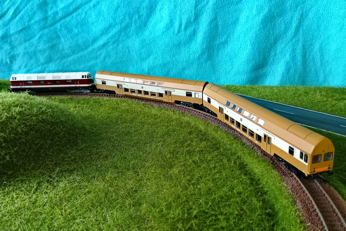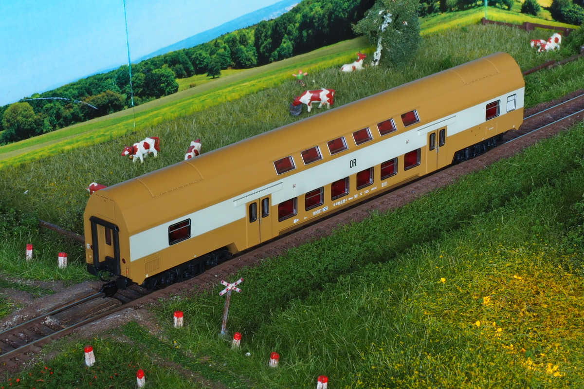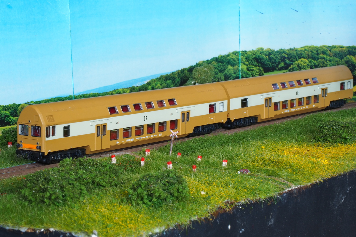 nowość od Roco i jednocześnie edycja specjalna dla Elriwy, czyli zestaw wagonów piętrowych z malowaniu "Senftopf" (DR, epoka IV, Roco 6280012-DB)