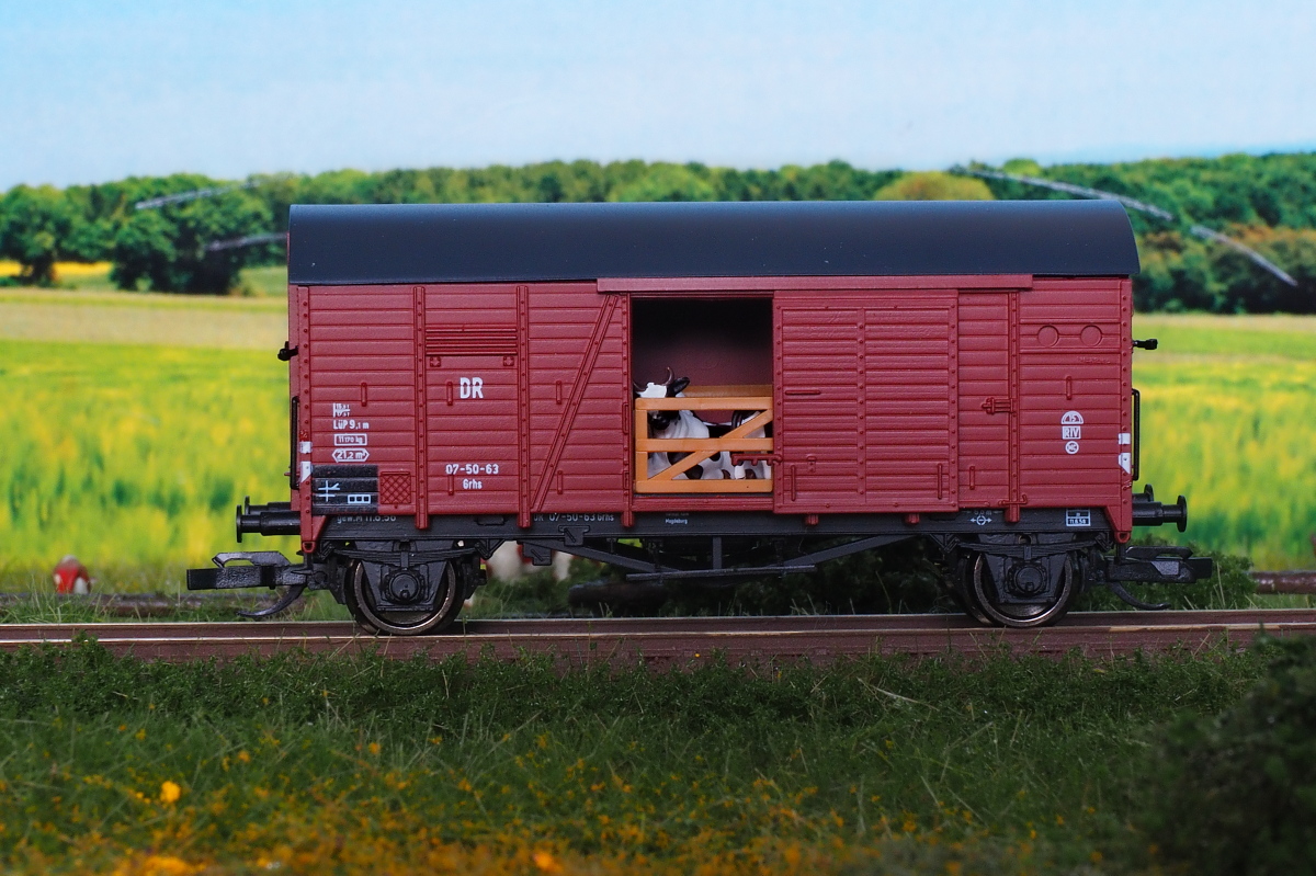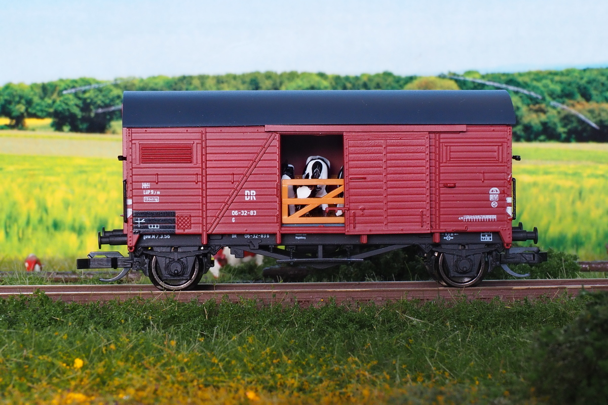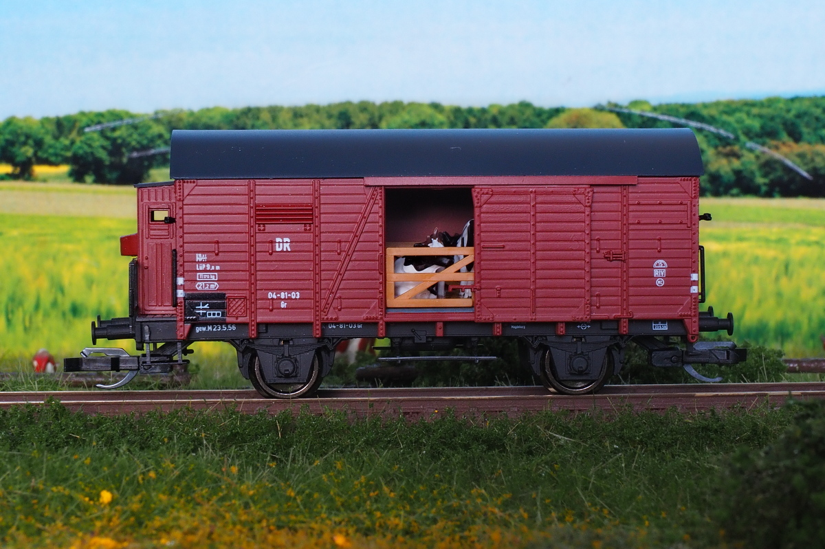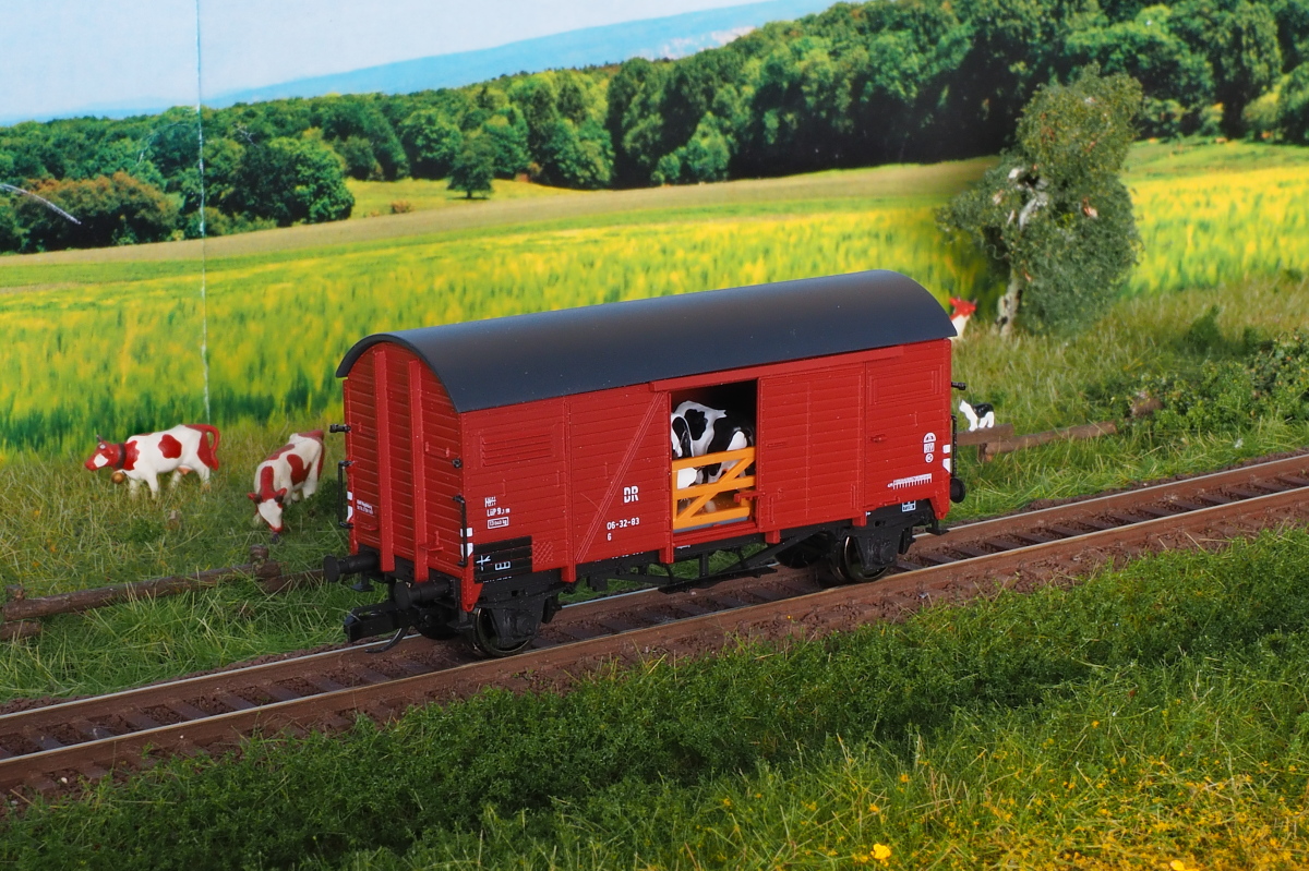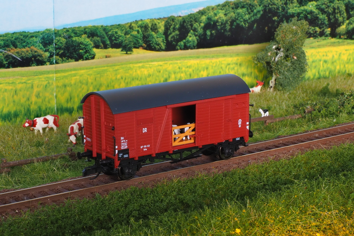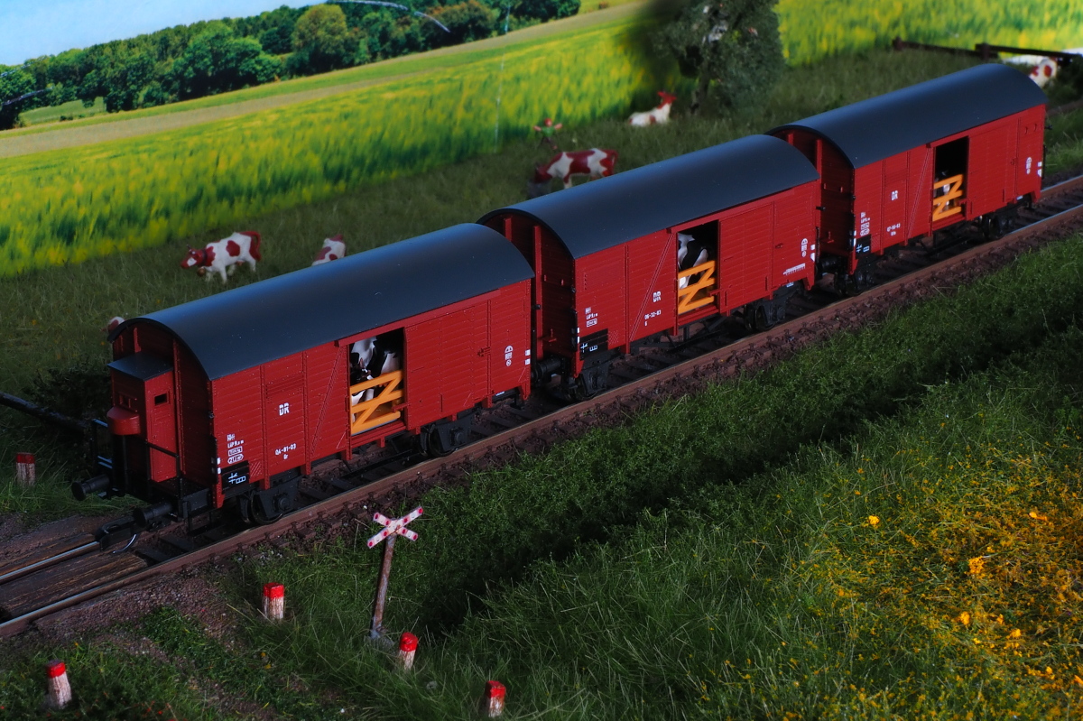 Zestaw trzech dwuosiowych wagonów krytych z krowami (DR, epoka III, Hädl nr kat.: 115613)