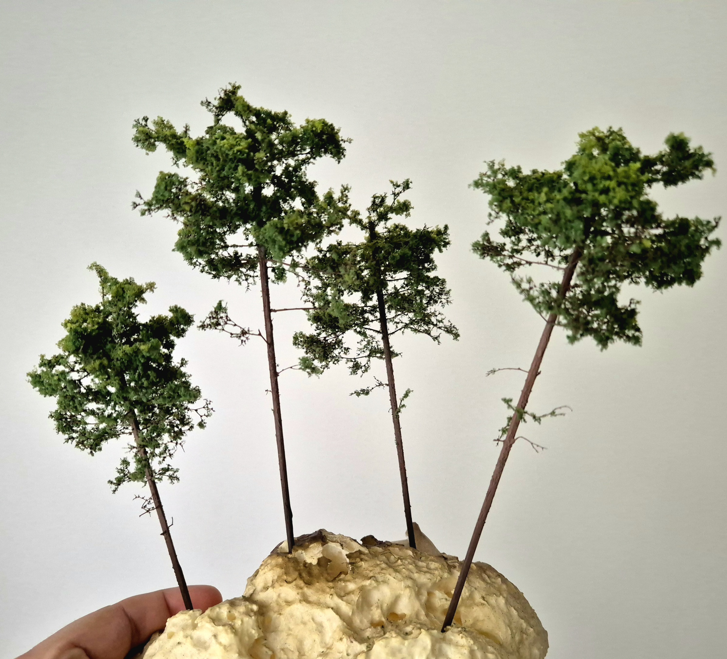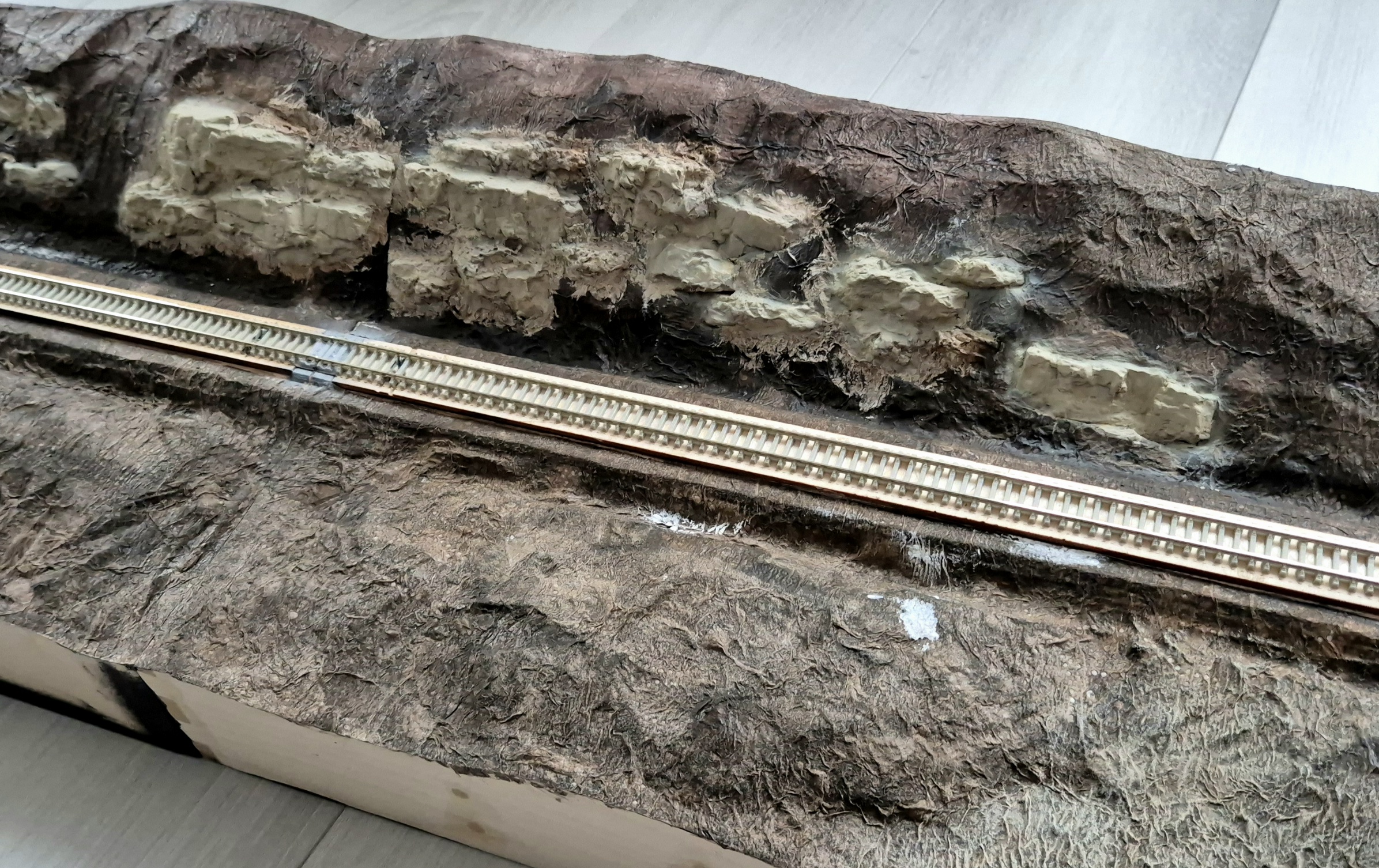 Teren zrobiony na papier toaletowy zaimpregnowany farbowanym na brązowo wikolem. Szykuję też moje pierwsze makietowe drzewka, wyszły chyba całkiem całkiem, ale muszę ich jeszcze trochę dorobić. Skały to odlewy gipsowe odlane w foremce i wklejone w teren, wstępnie zaimpregnowane wikolem z farbą. Zdjęcia niestety pod światło, więc detale zjedzone... Ale któregoś dnia będą lepsze.