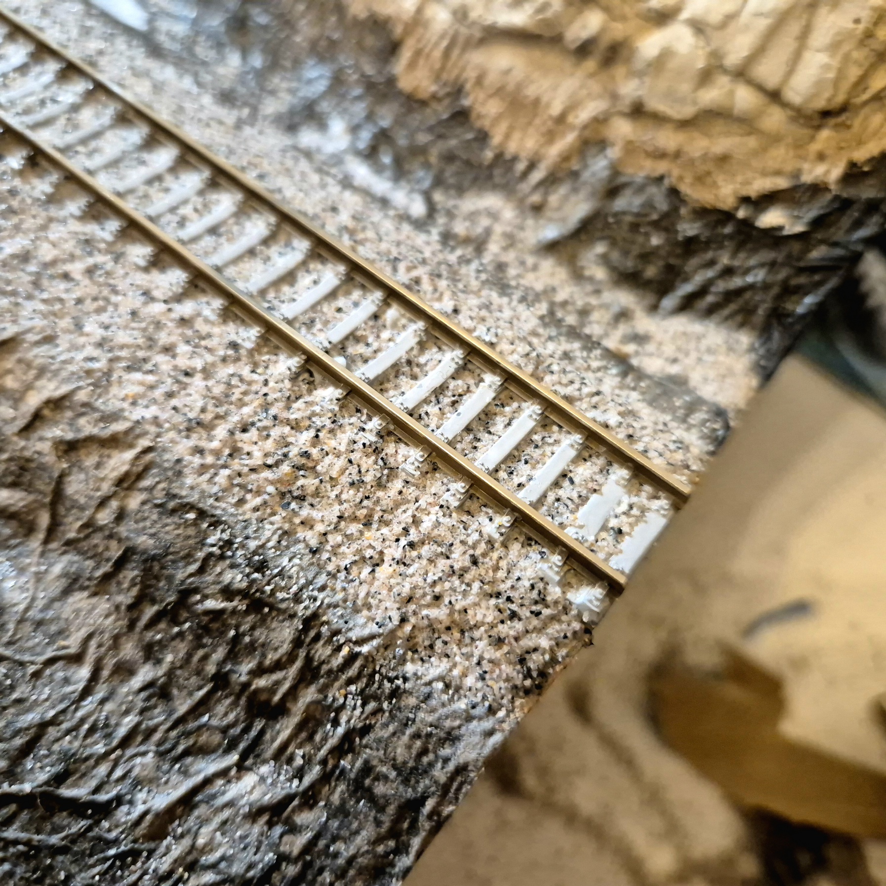 Raport z pola walki - pierwsze szutrowanie za mną. Trzeba przyznać, że nie jest to przyjemna część budowy makiety. Użyłem miksu szutru Noch do skali N/Z, miksowałem szary z brązowym w stosunku 1:2. Zalałem tory miksem matowego Mod Podge z wodą w proporcji 1:3 z dodatkiem IPA i płynu do naczyń. Idealnie poukładałem tłuczeń żeby nie było go na szynach i podkładach, po czym przy zalewaniu klejem tłuczeń poprzesuwał się na podkłady i musiałem każdy czyścić