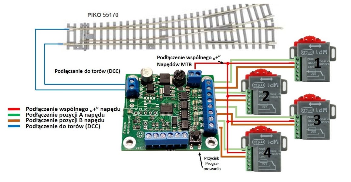 Analogicznie gdy mamy np. dwa rozjazdy oddalone od siebie o całą stację, i trzeba przez kilka metrów ciągnąć przewody zasilające napęd, to wydaje się zasadne zastosowanie pojedynczego dekodera akcesoriów montowanego w pobliżu każdego z napędów.