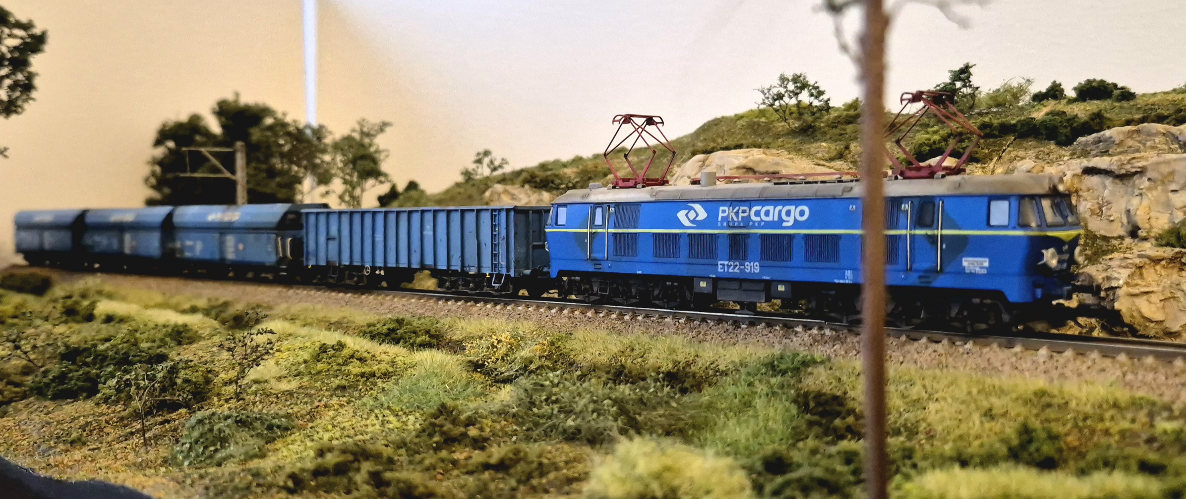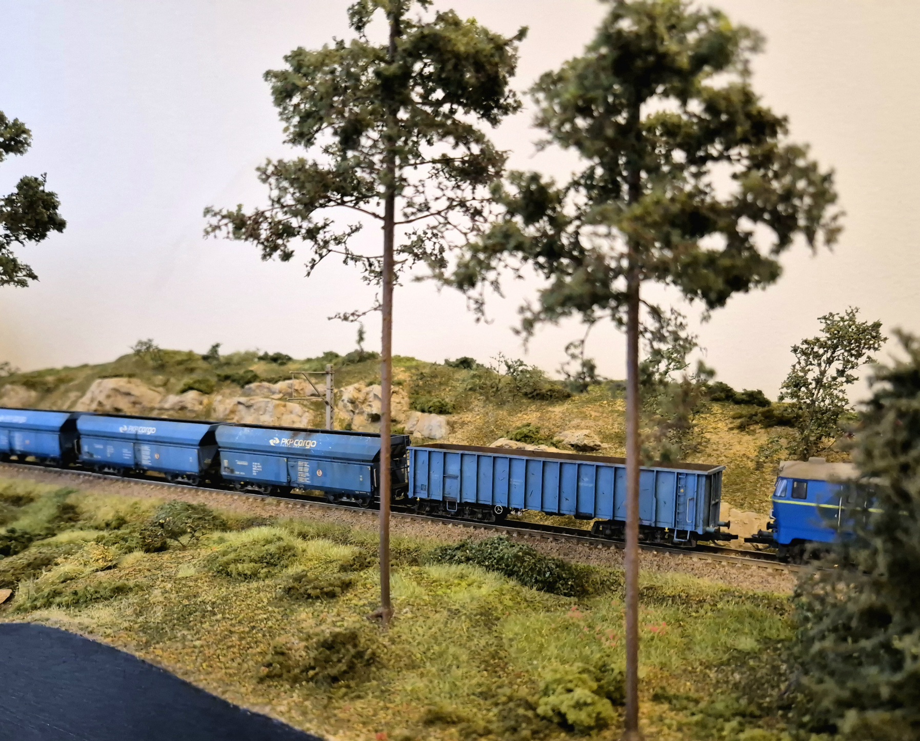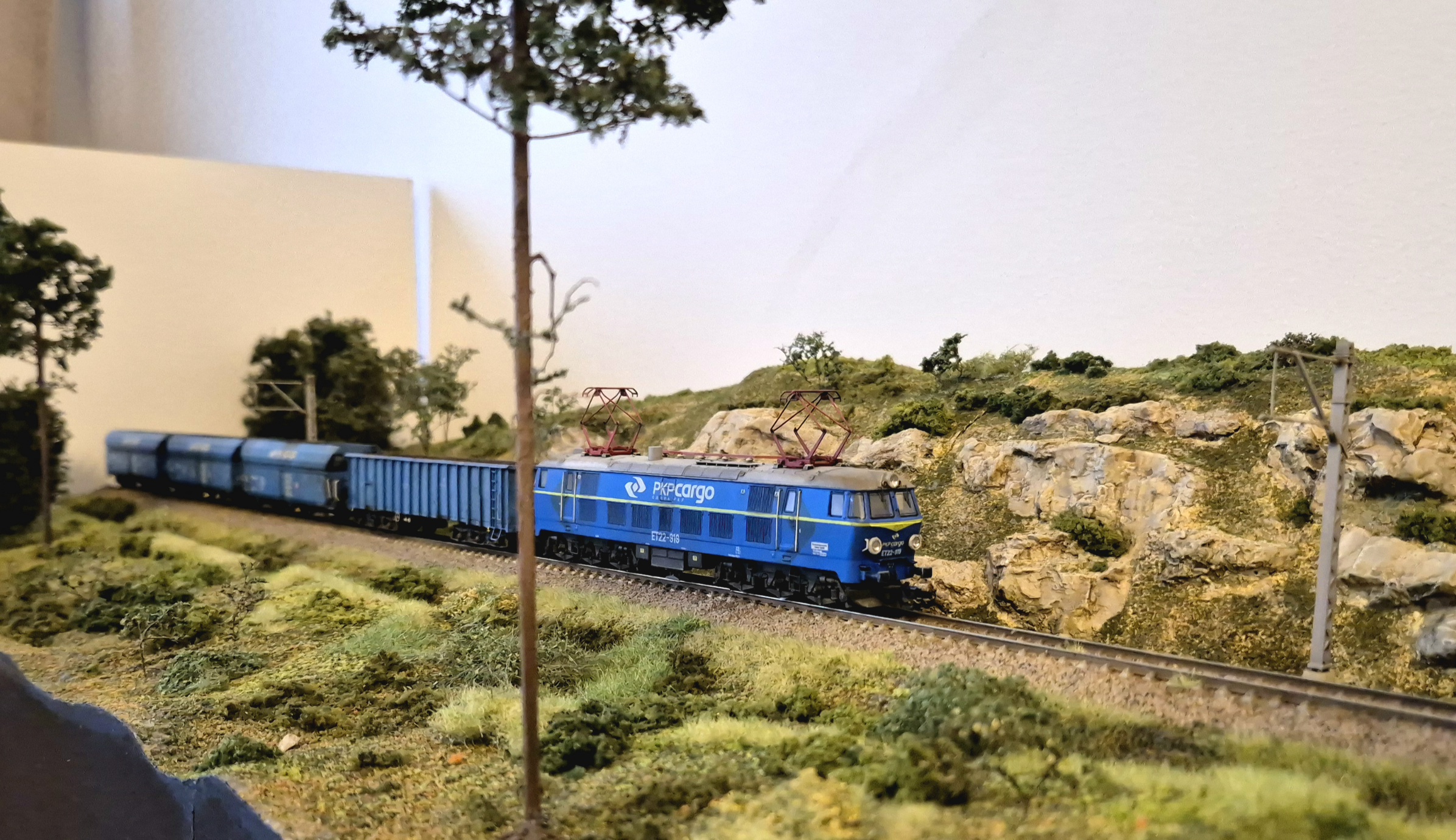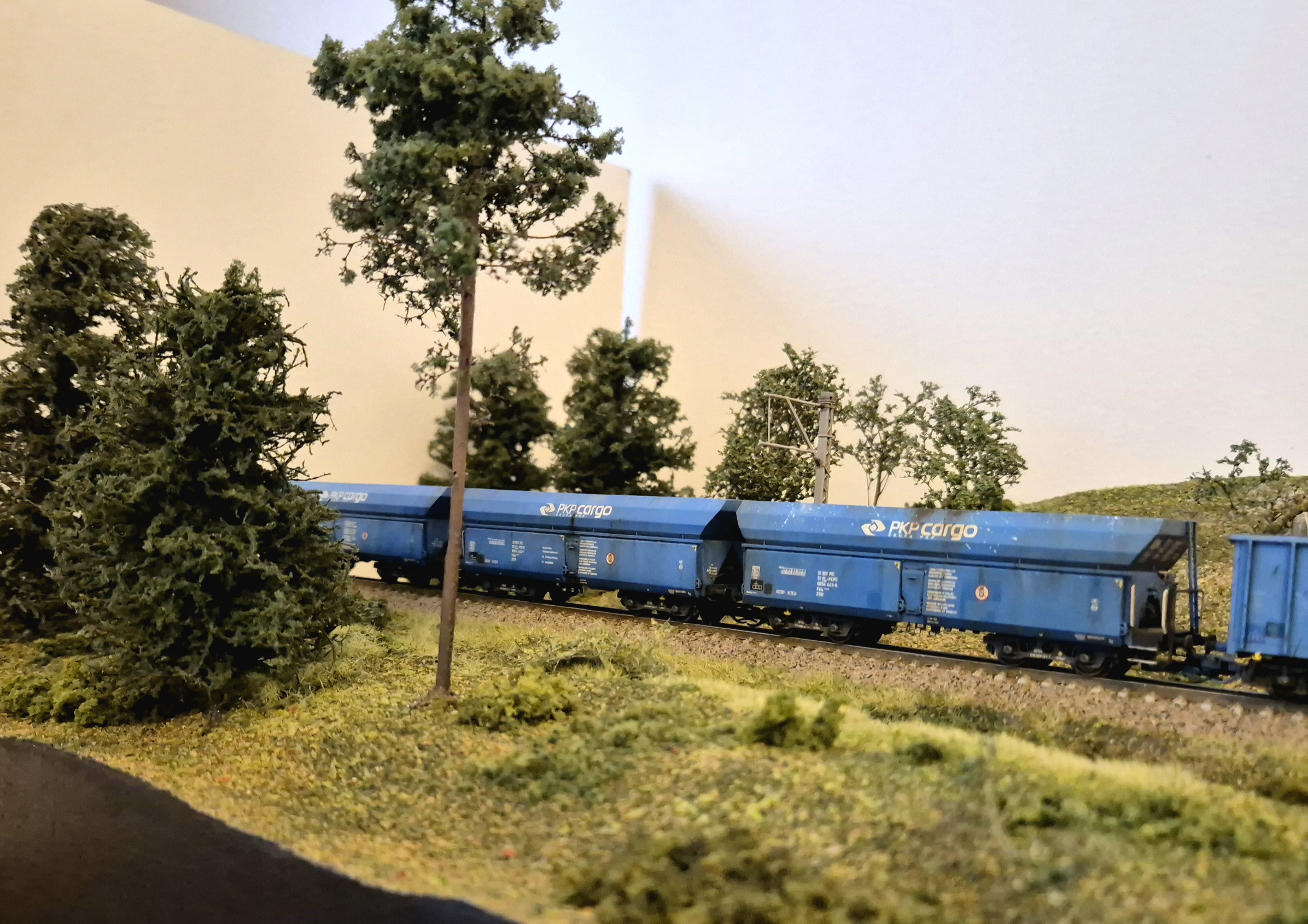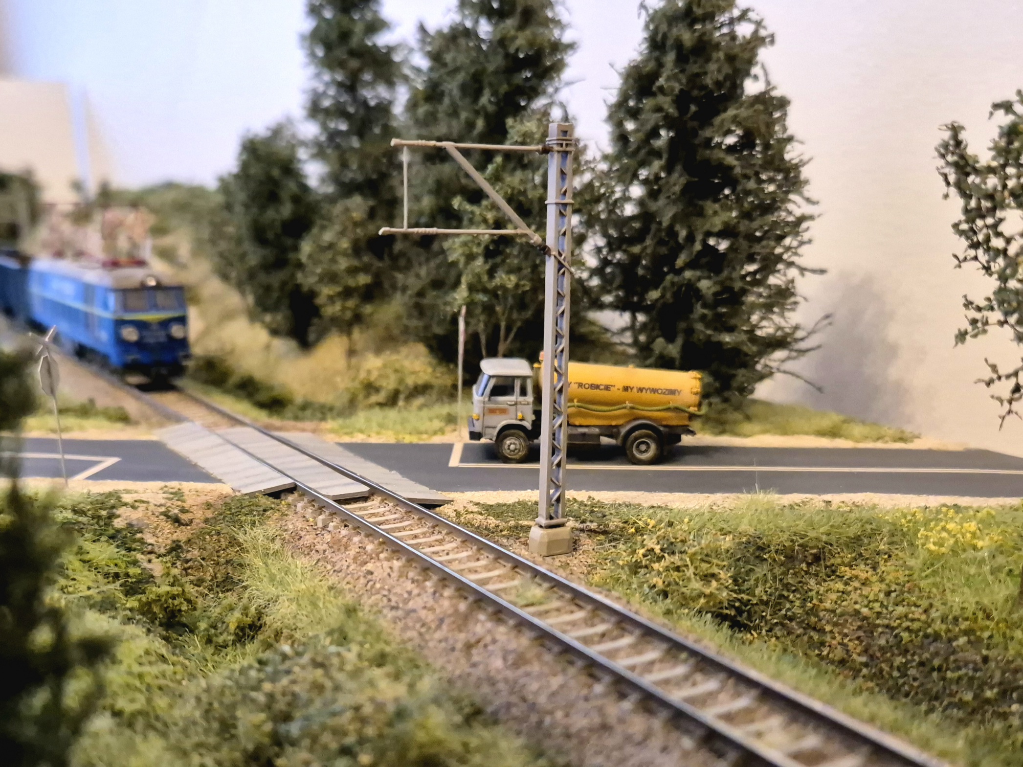 Moduł wzbogaciłem o nowe drzewa i krzewy. Mam też demontowalne słupy trakcyjne ze sklepu microcity.pl. Słupy fajne, ale prawie wszystkie wysięgniki połamały mi się przy wycinaniu z podpór, natomiast skleiłem je i pomalowałem. Wyglądają spoko, szkoda, że nie ma ich nadal dostępnych w microcity :/ Liczyłem, że kupię coś co będzie dostępne na wymianę w razie czego.