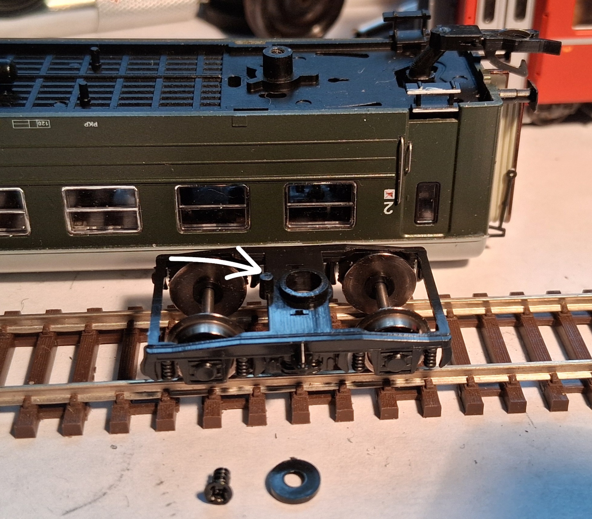 Jeden wózek powinien być dość swobodnie zawieszony, bo wtedy wagon łatwo wpasowuje się w nierówności torów. Przerabiałem to przy starych bttb-wskich y-kach. Oba wózki zamocowałem śrubą i nakrętką, mogły się obracać tylko lewo - prawo. Efekt był taki, że wagon tracił kontakt z torami przy każdym wejściu na podjazd położony w łuku i wykolejał się. Mimo, że wózki się skręcały to wszystko było zbyt sztywne. Gdy jeden wózek jest półsztywny (tzn. skręca się na lewo prawo, ale nie na boki), a drugi wózek ma swobodę ruchu we wszystkich kierunkach wtedy wagon się nie chwieje, ale dopasowuje do krzywizny szyn i nie wykoleja.