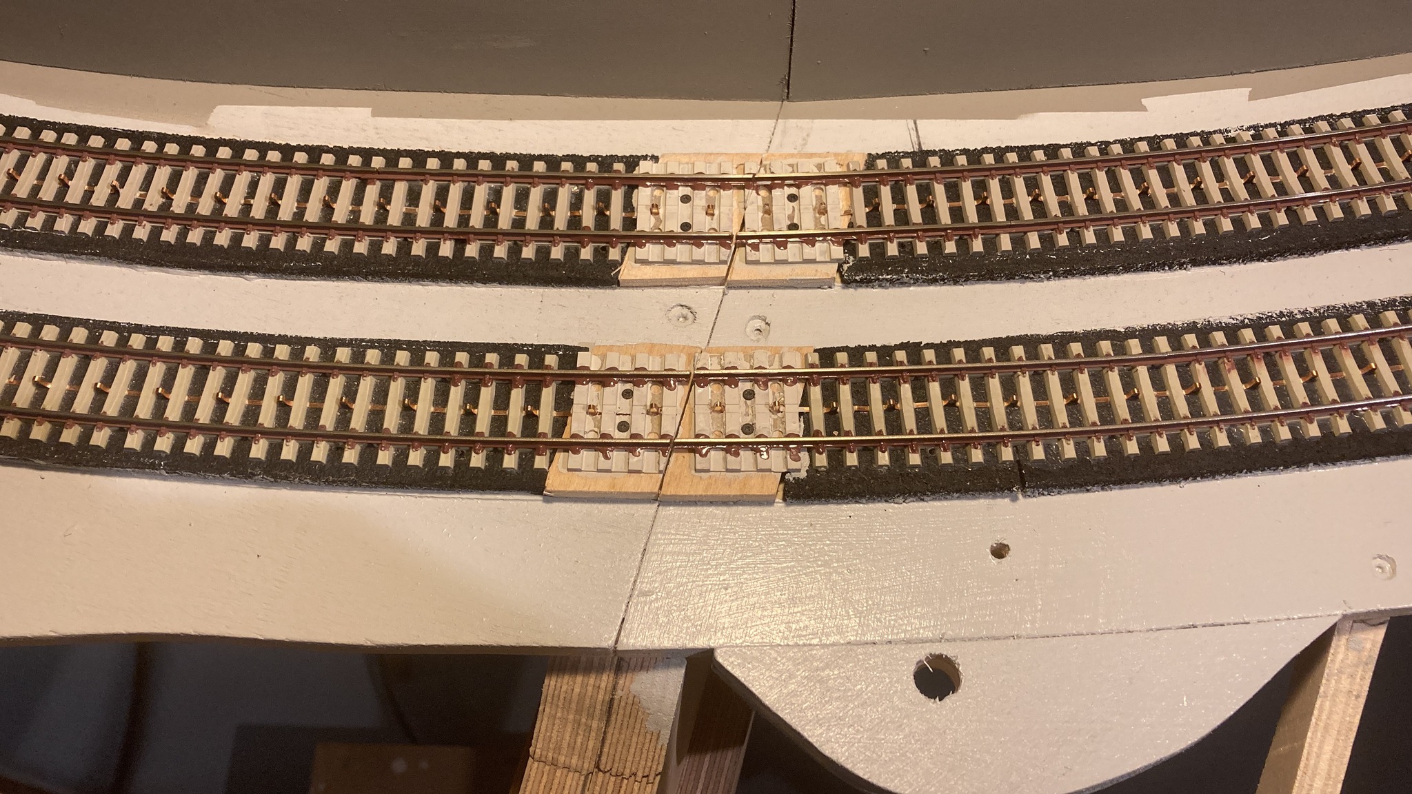 Przy okazji elegancki sposób na łączenie segmentów makiet z torem łukowym i to na ukos, braci większych (tu: tory systemu Maerklin):