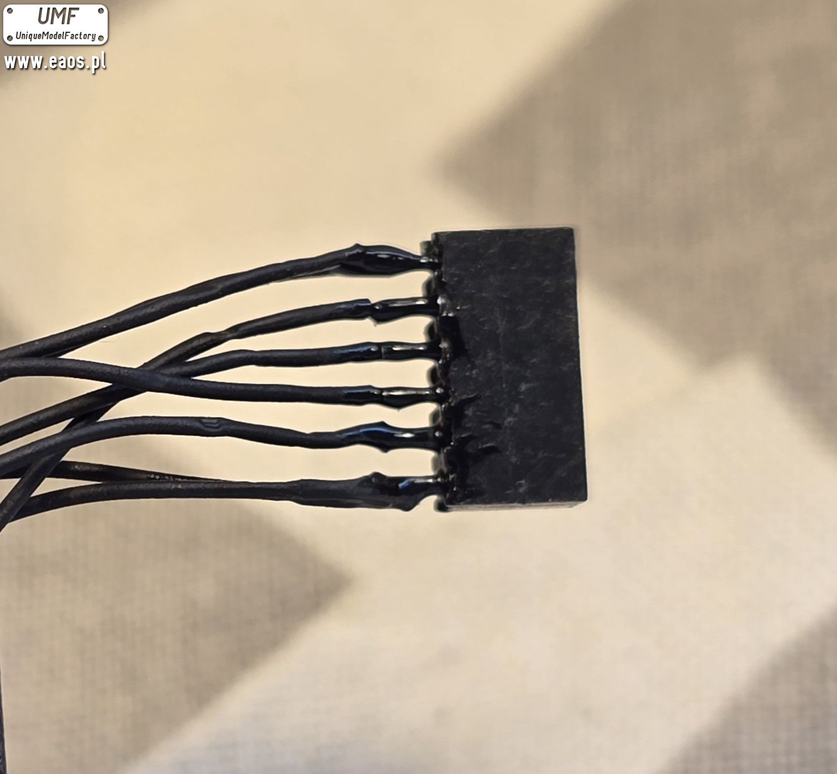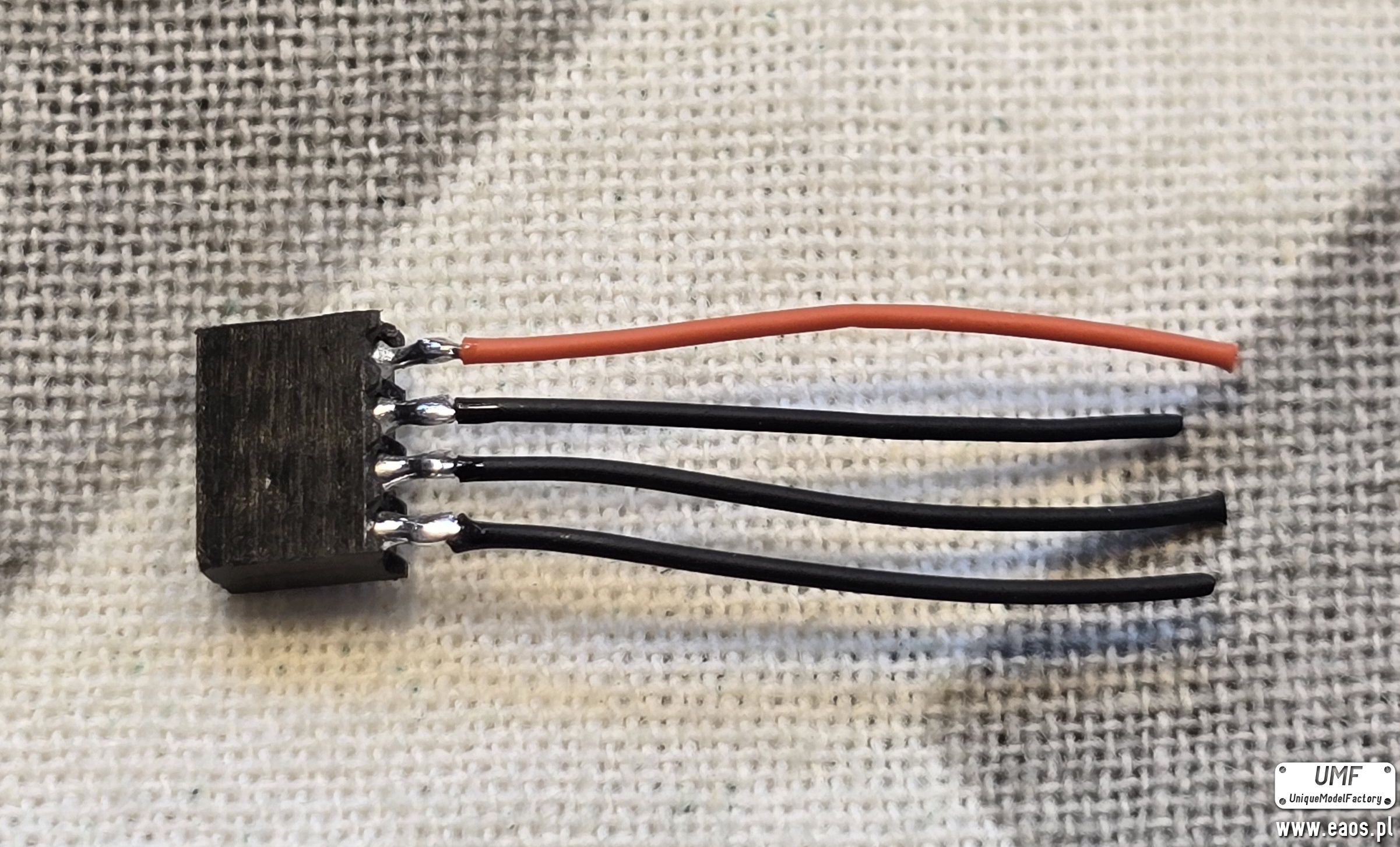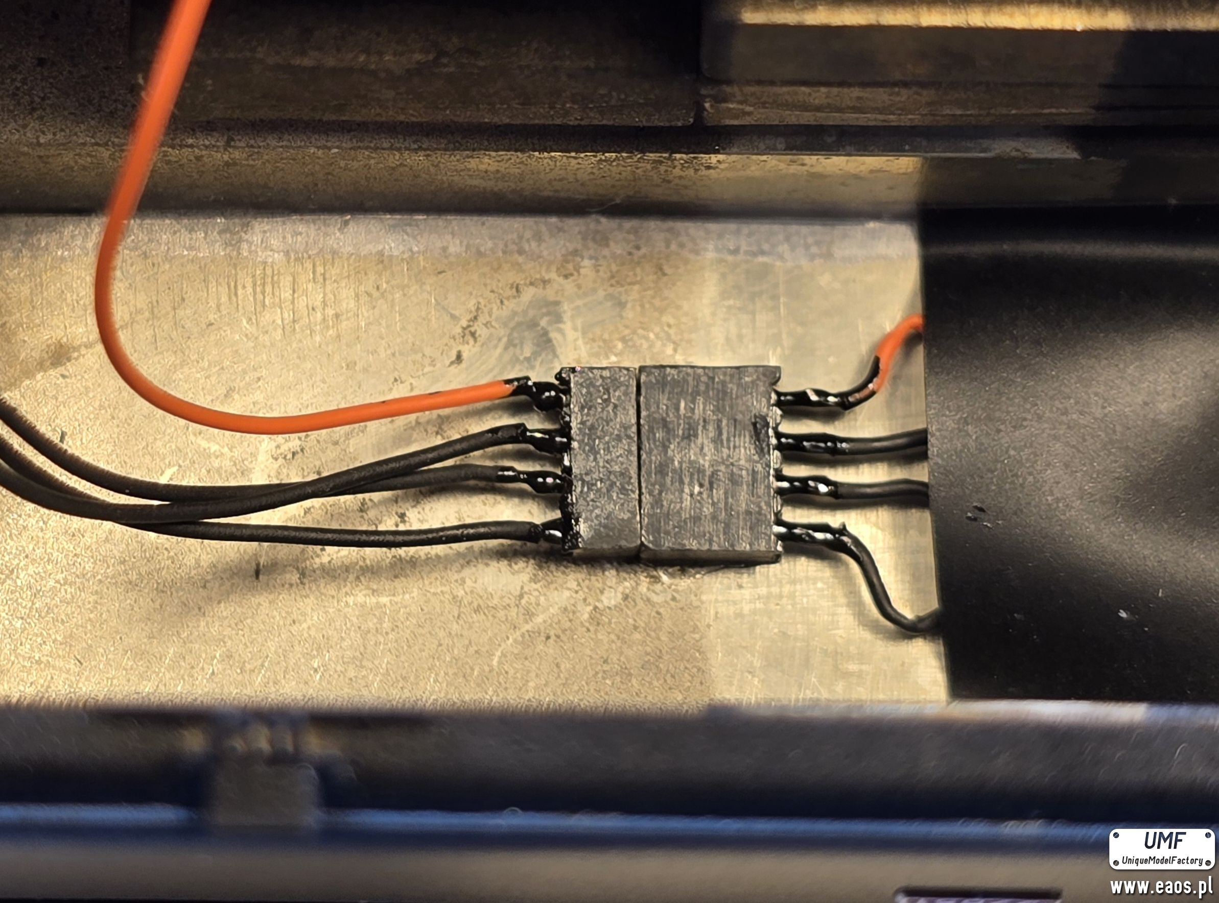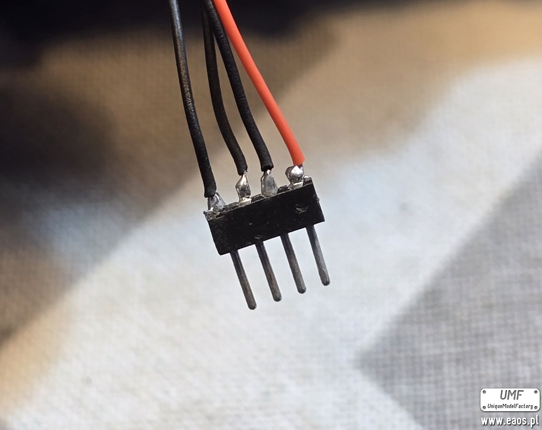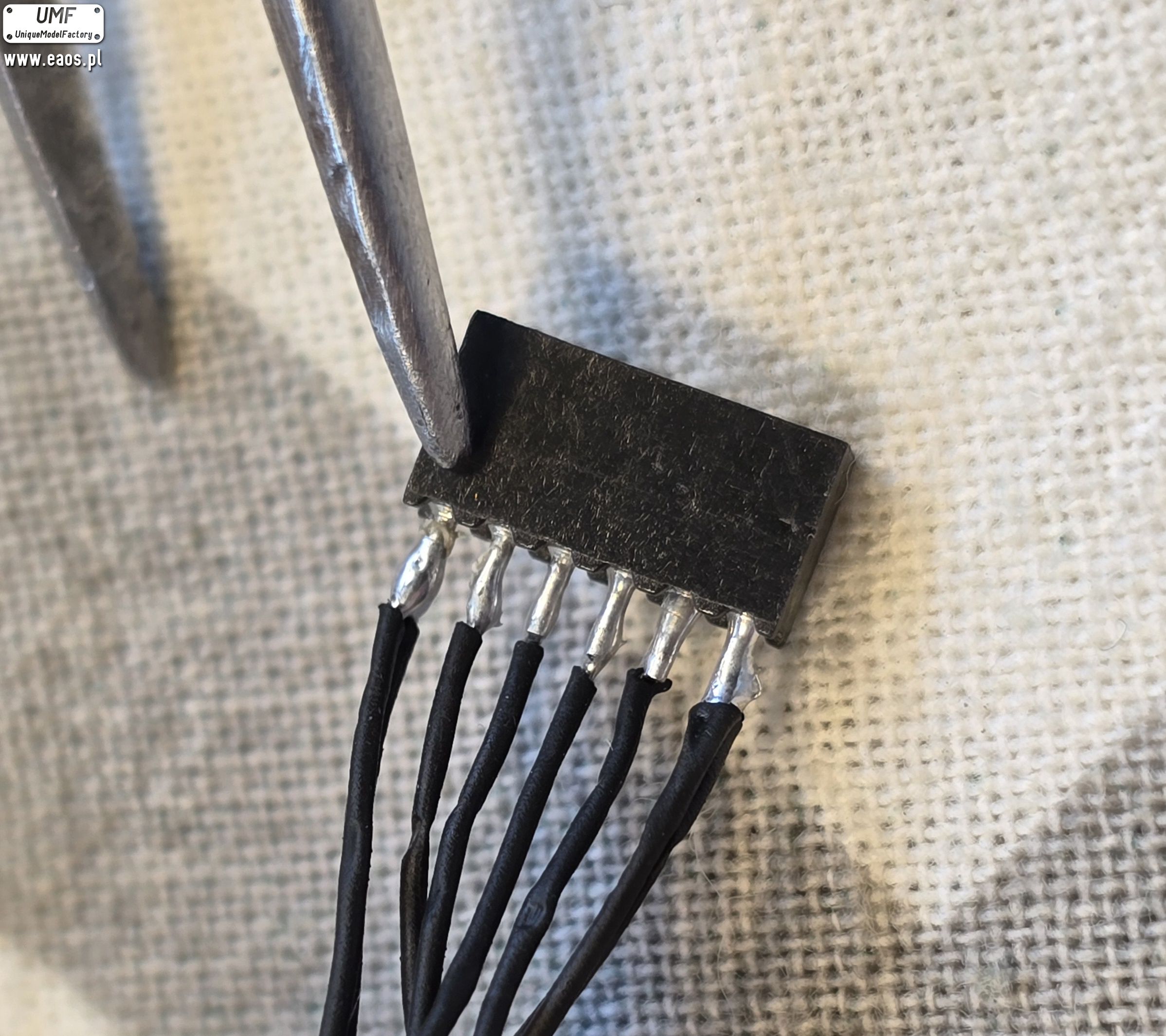 Przewody pod parowozem i z tendra lutuję do wtyczek. Wtyczka z rasterm 1,27mm.