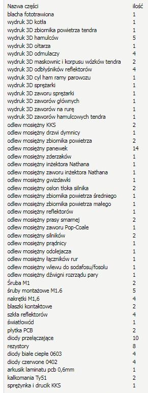 Czy znany jest już wykaz części, które trzeba dodatkowo zamówić do tego modelu?