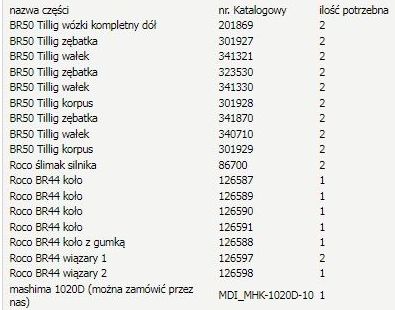 :arrow: Do zestawu należy zamówić poniższą listę części: