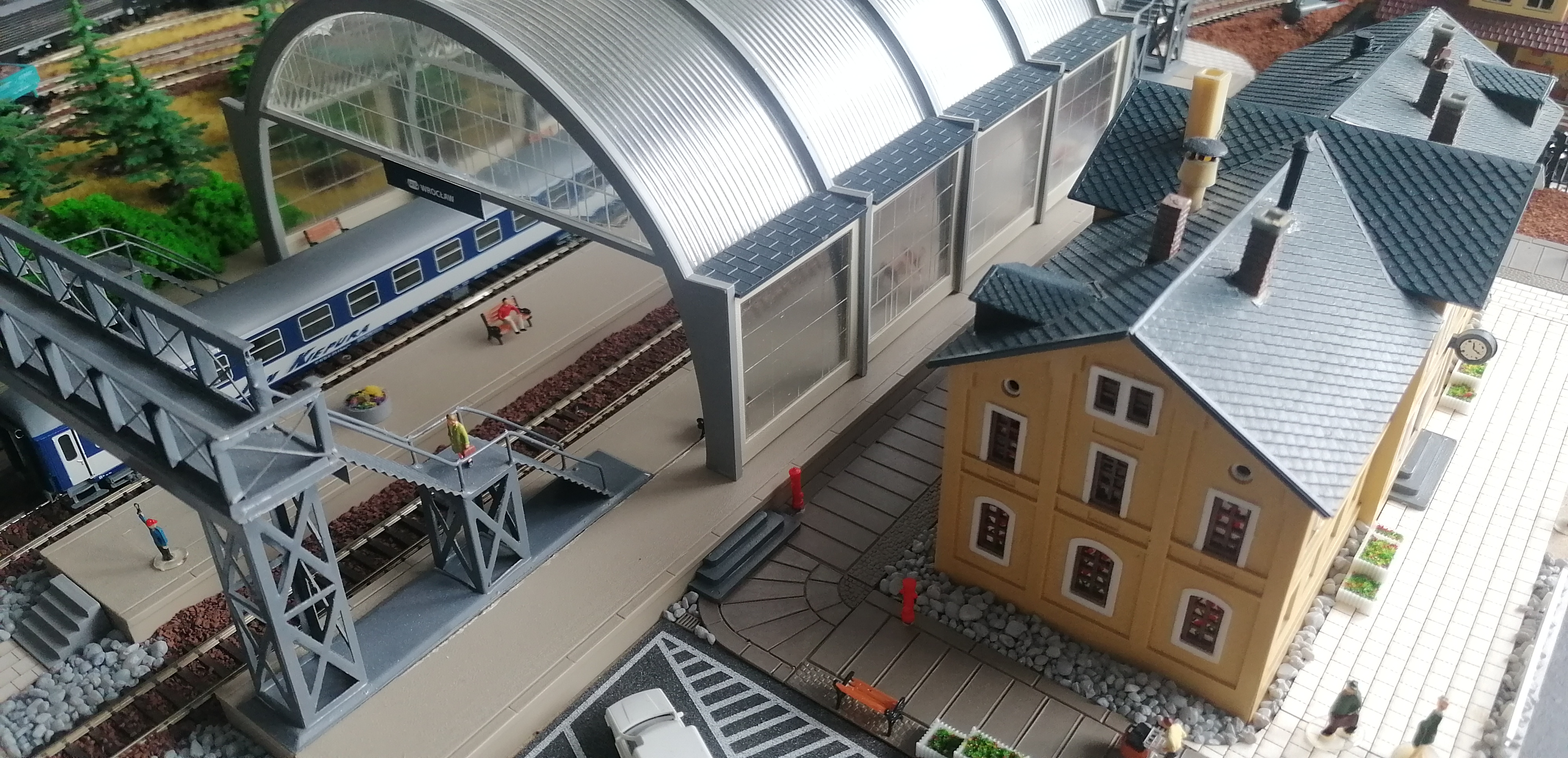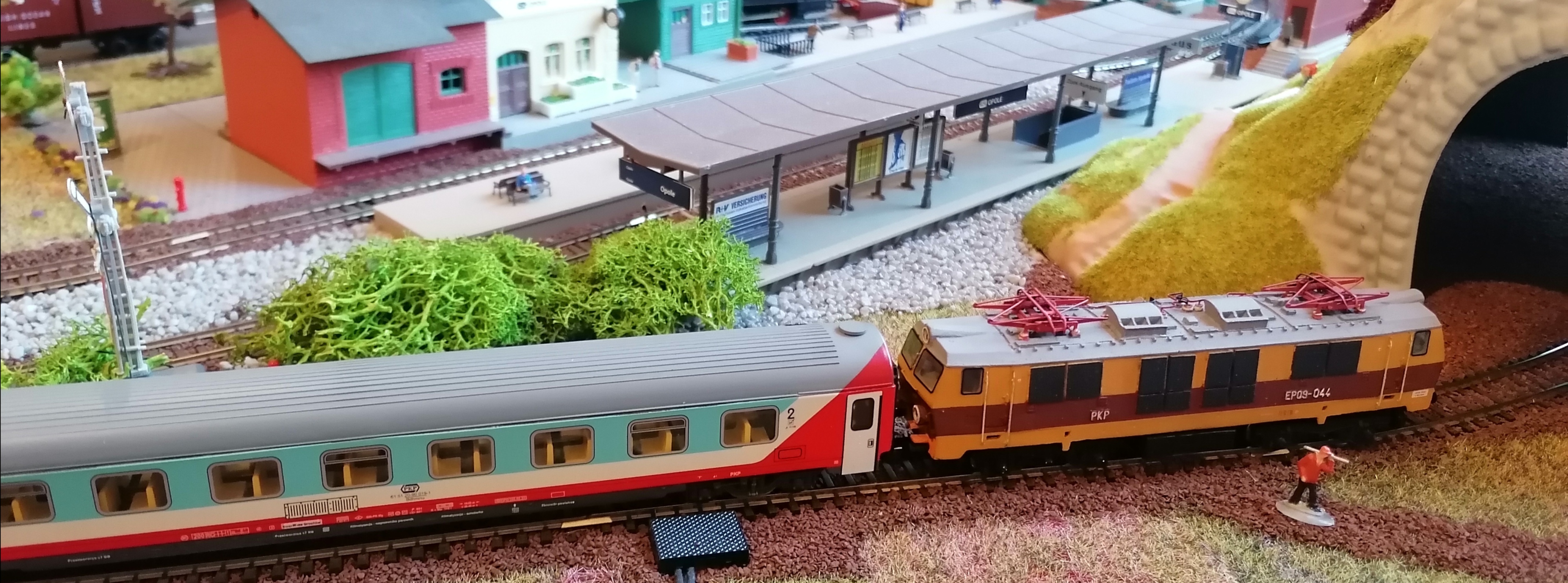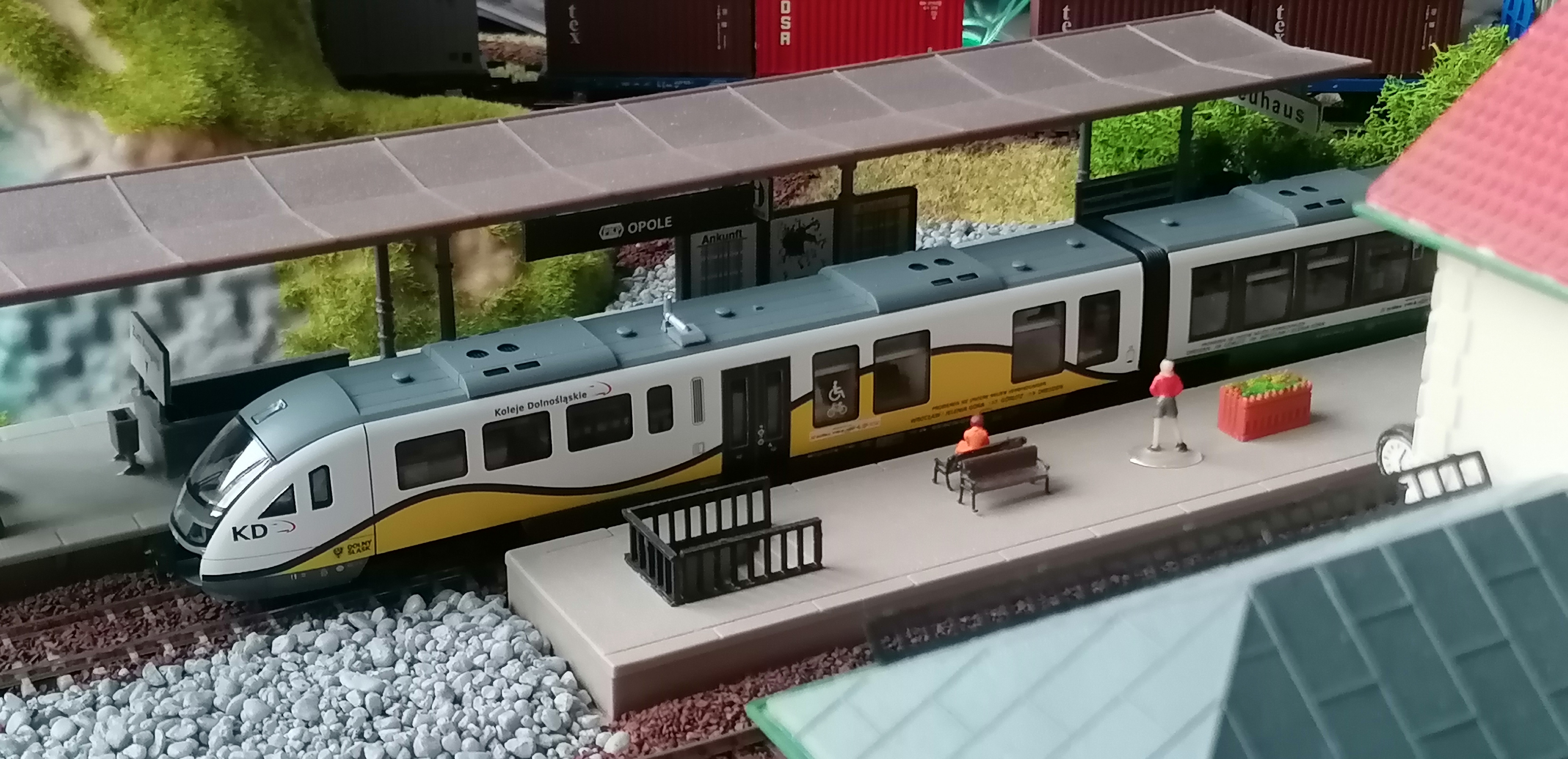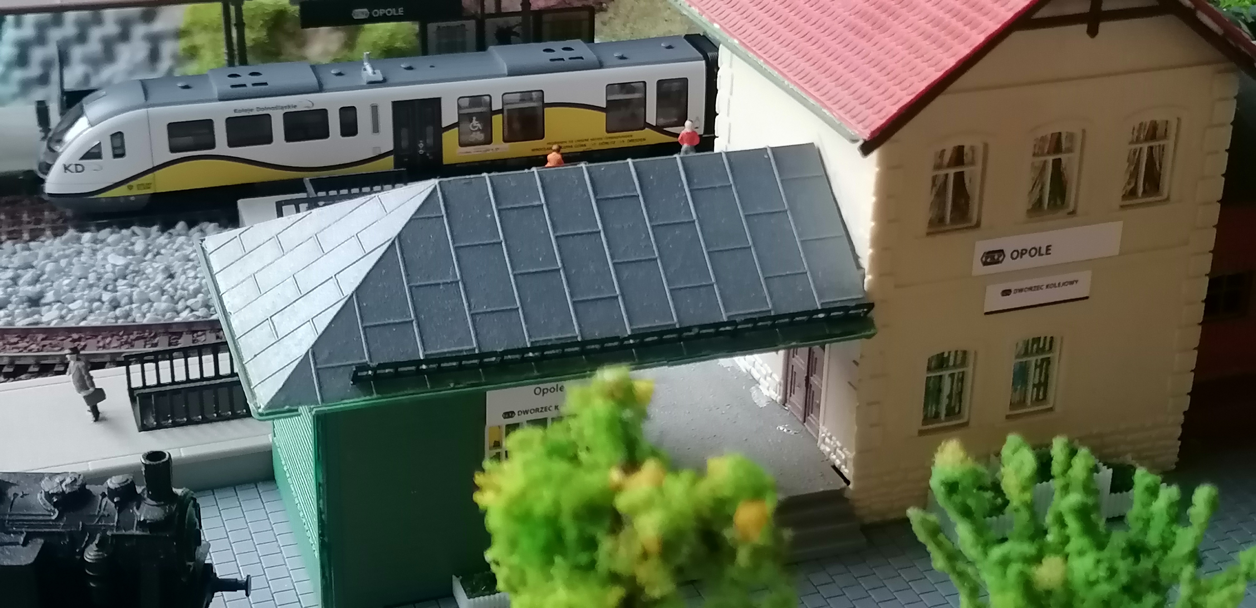 Jeśli planujesz dalsze prace, to warto poprawić szczegóły, np. na zadaszonym peronie w Opolu jest prawidłowy napis "Opole", ale na jego końcu jakiś niemiecki "...ehaus" (usuń lub zmień). Z grubszych rzeczy to niewątpliwie rażą białe "morskie" kamienie. Ja bym to wydłubał i zakleił trawą.