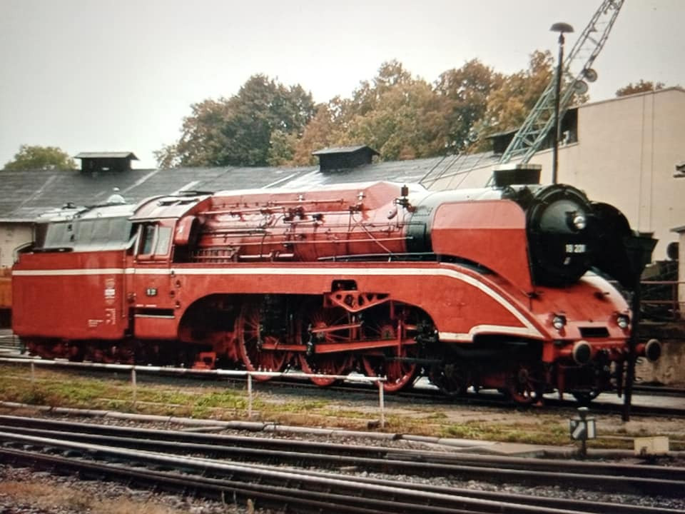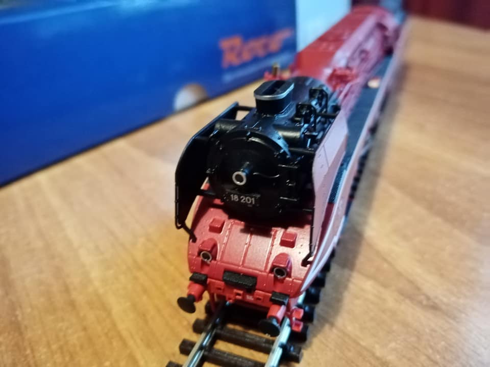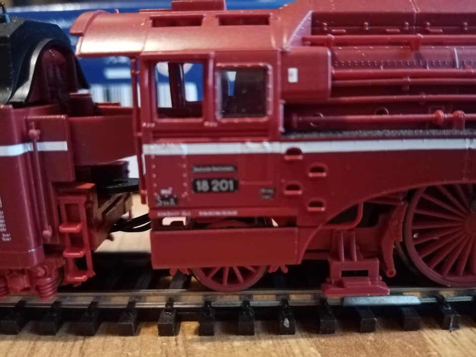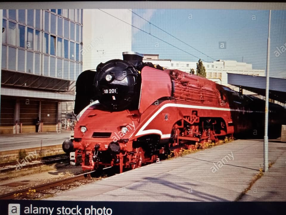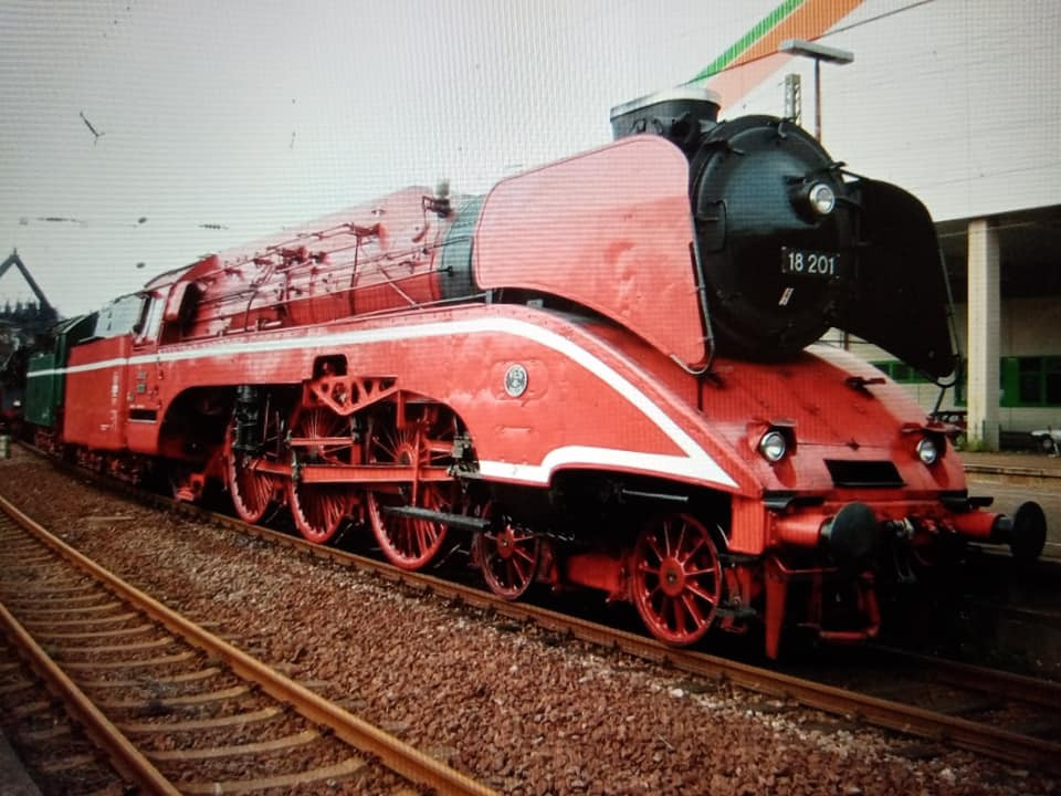 "Nosorożec lub Predator czyli ksywki maszyny 18 201 która była testowana w NRD do prędkości 160km/h z wagonami pasażerskimi wyrabianymi dla bloku wschodniego. W tym malowaniu nietypowym występowała tylko dwa lata razem z emblematem firmy Roco. Swego czasu częsty gość w Polsce."